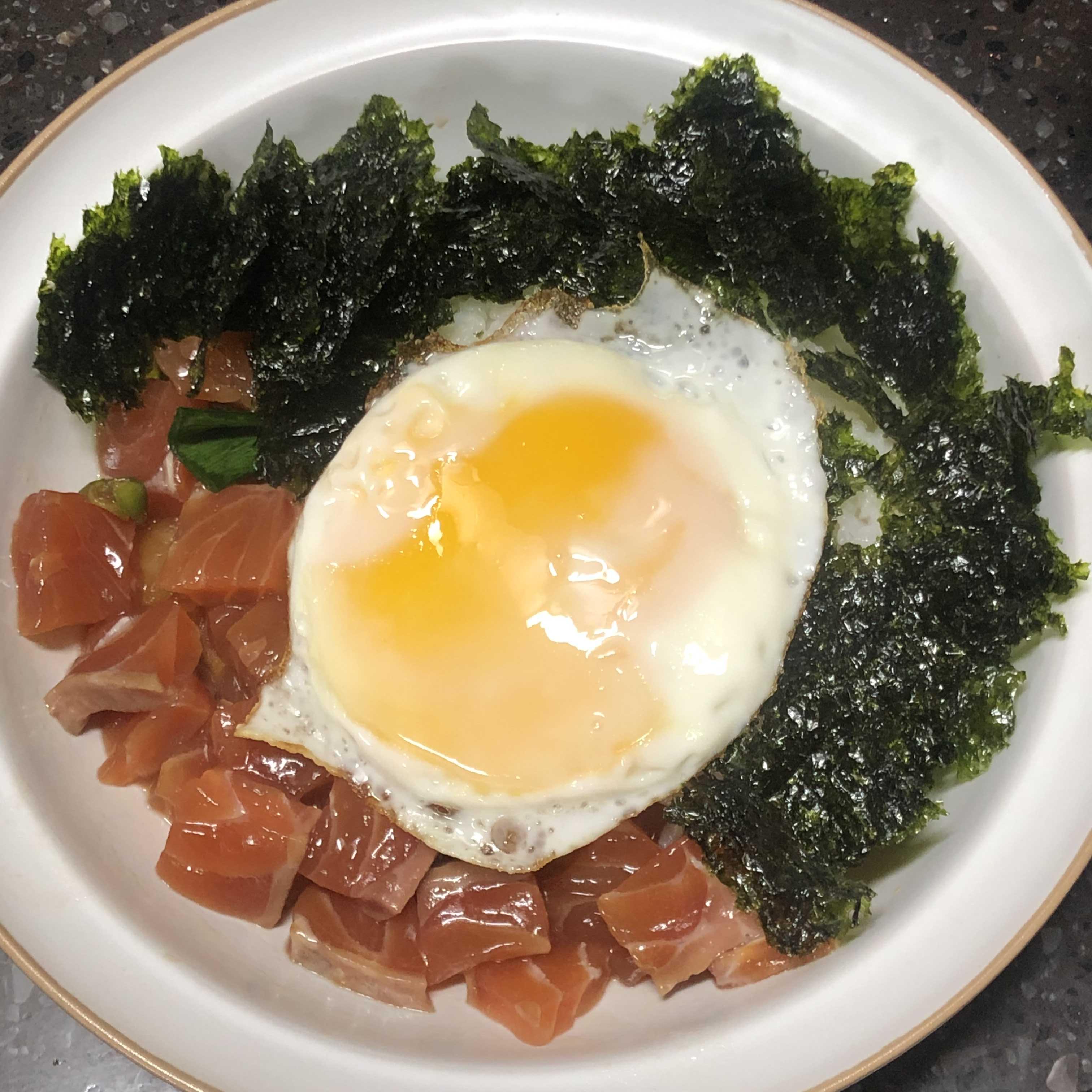 별 다른거 없이 그냥 계란후라이 하나 부치고, 김 있던거 찢어서 뿌려줬어요.