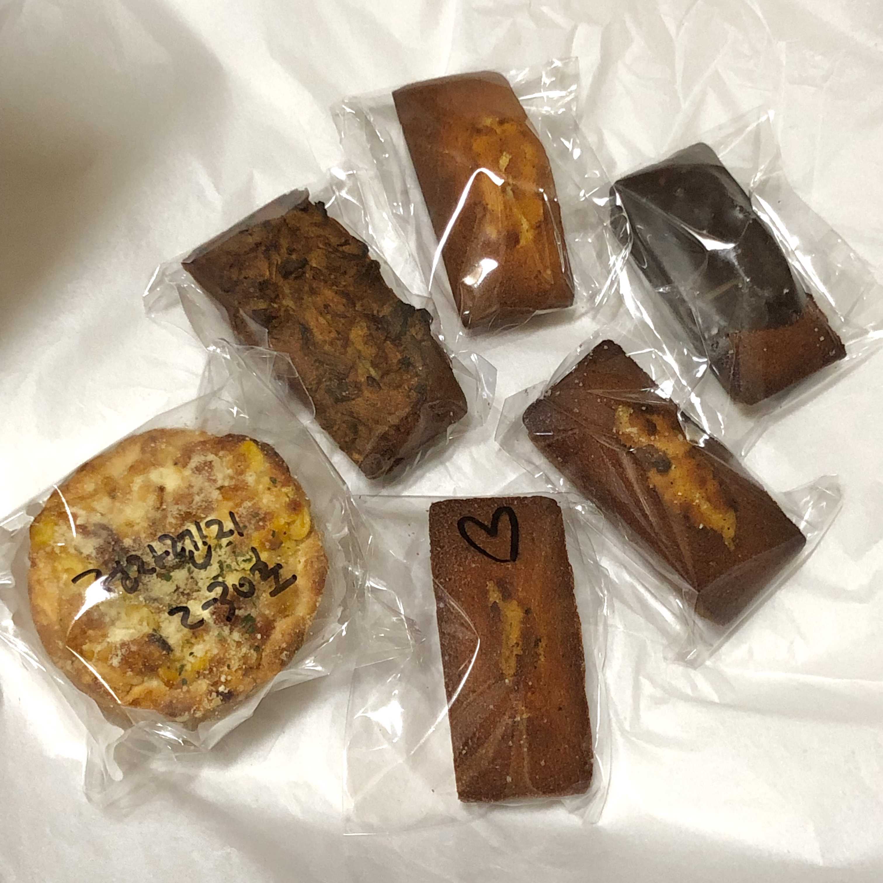 저는 휘낭시에 4가지맛 한개 씩과 옥수수스콘을 주문했어요. 휘낭시에가 다섯개 들어있어서 오잉 했는데, 서비스로 넣어주신 휘낭시에에 하트를 그려주셨네요!