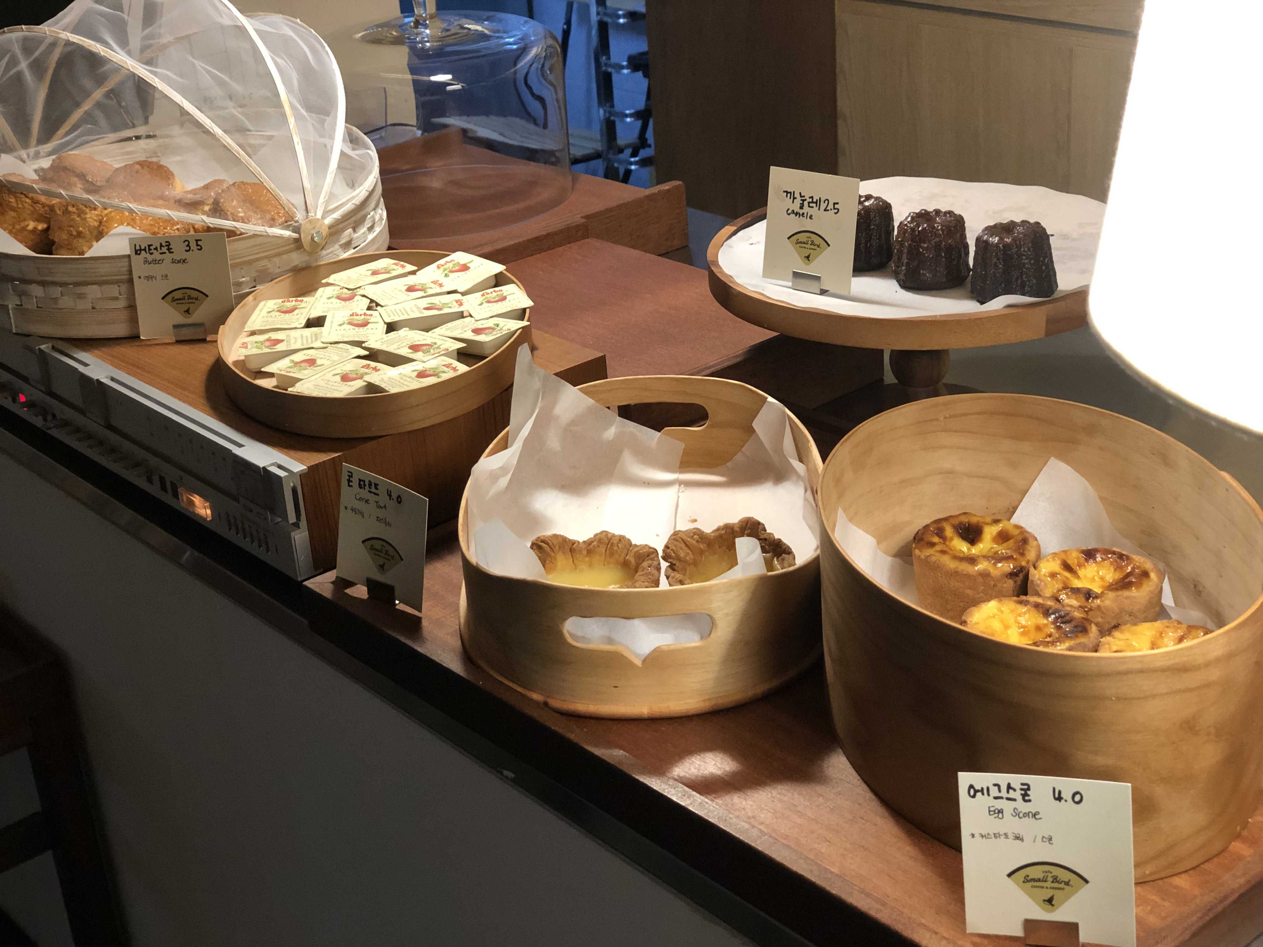 주문하러 들어가자 몇 가지 빵 디저트류가 보였습니다.