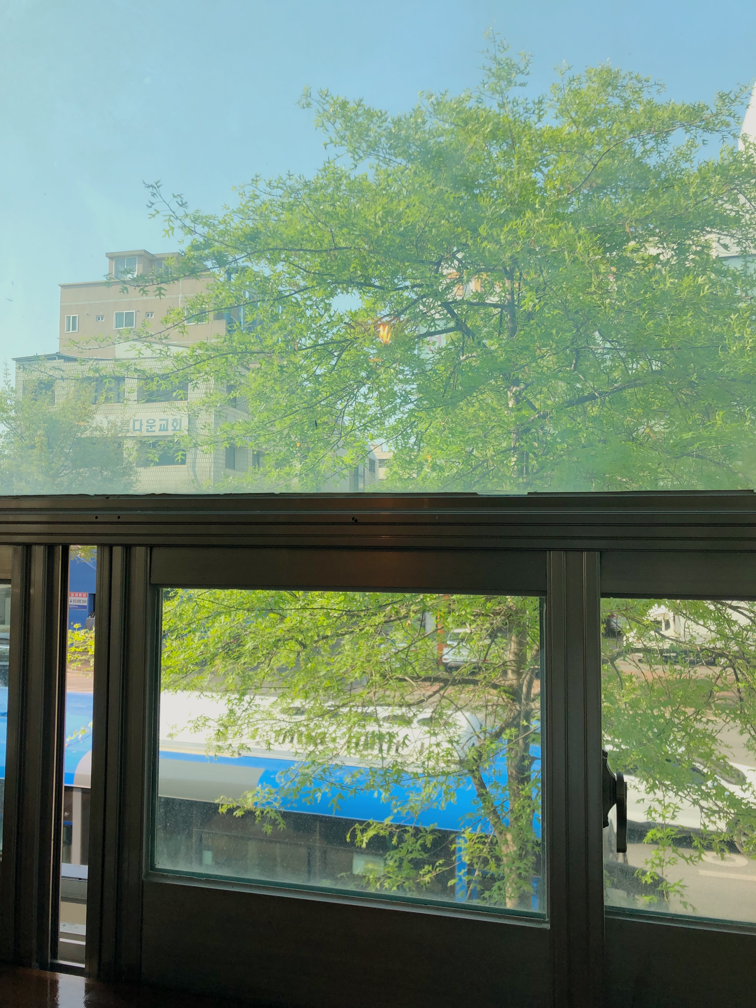 창밖으로 파릇파릇한 가로수가 꽉 차 보이는것이 넘나 싱그러운 풍경 ★