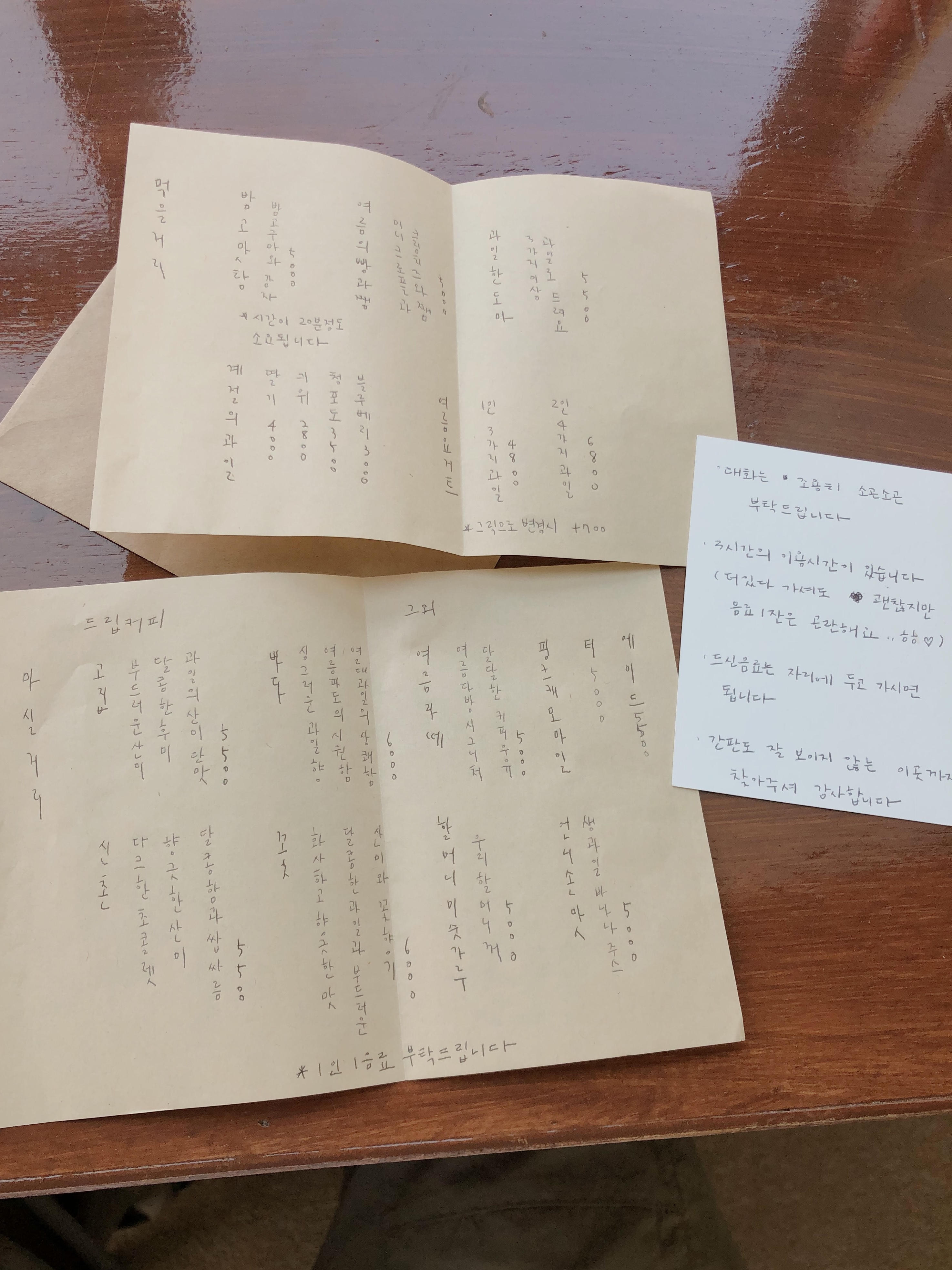 특이하게도 편지봉투 안에 손글씨로 정성껏 써내려간 종이 메뉴판이 들어있었어요.