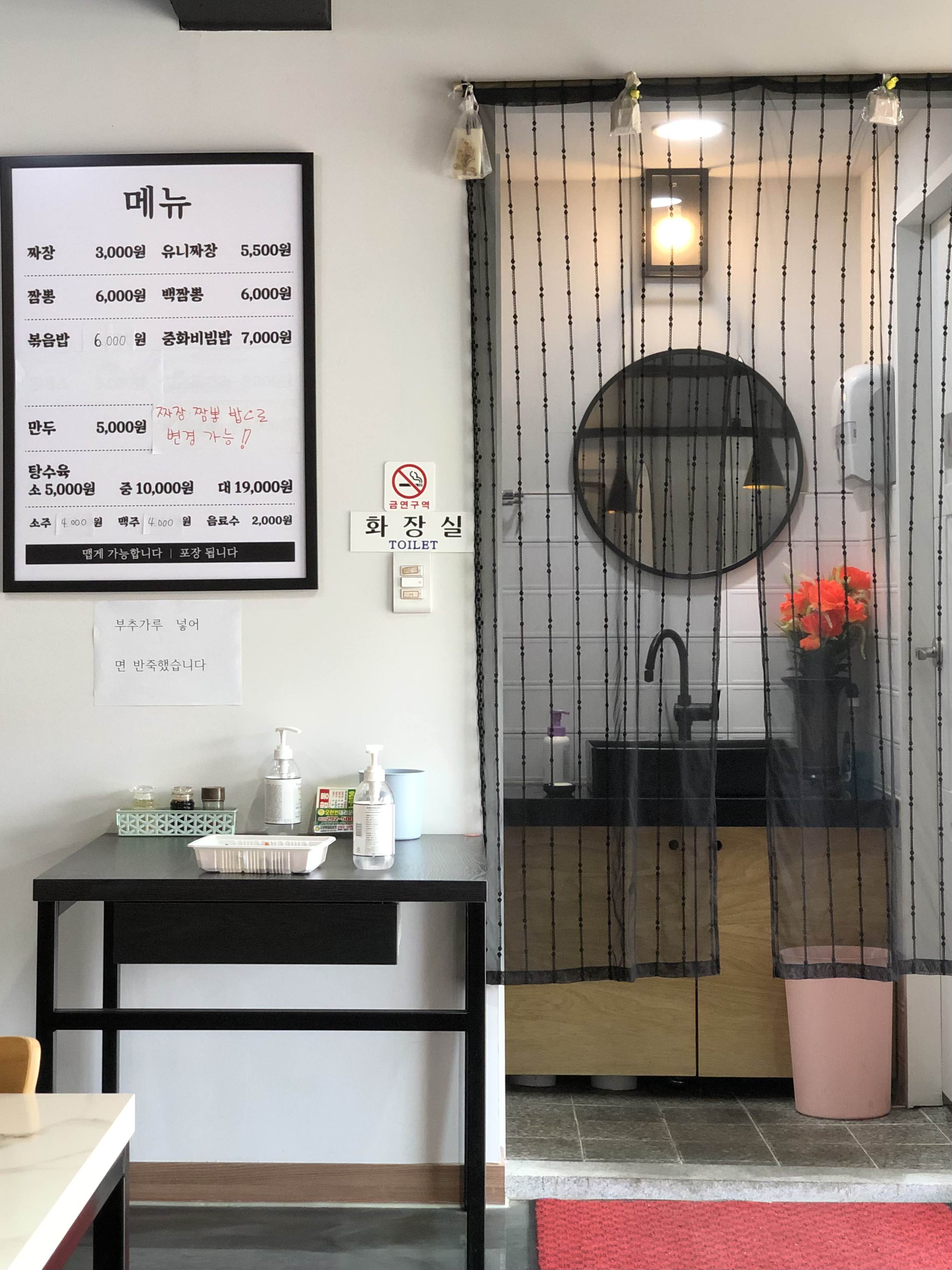 메뉴판 옆쪽으로는 화장실이랑 손 씻는 곳이 있어요.