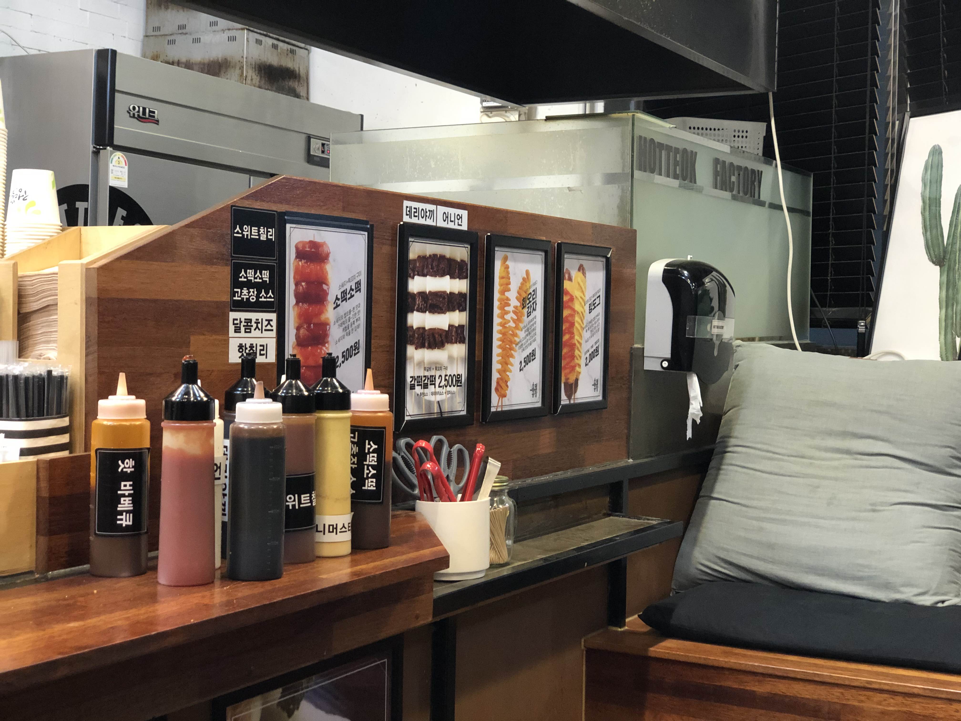 한쪽에 소떡소떡소스랑 칠리소스 등 각종 소스류가 구비되어있습니당.