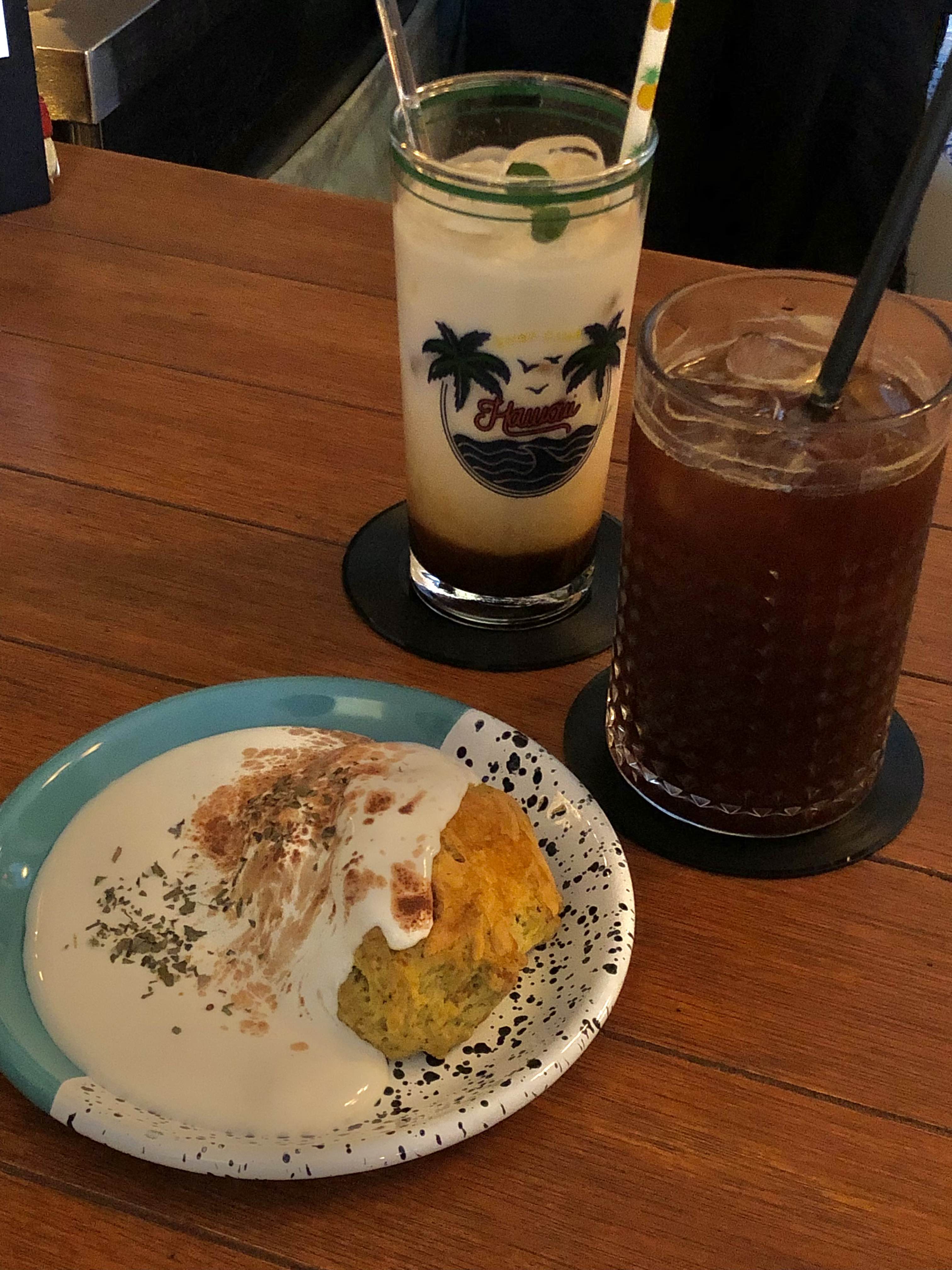 저는 아이스아메리카노, 언니는 몰디브라떼…?(맞지싶은디 아닐수도…) 디저트로 바질스콘~