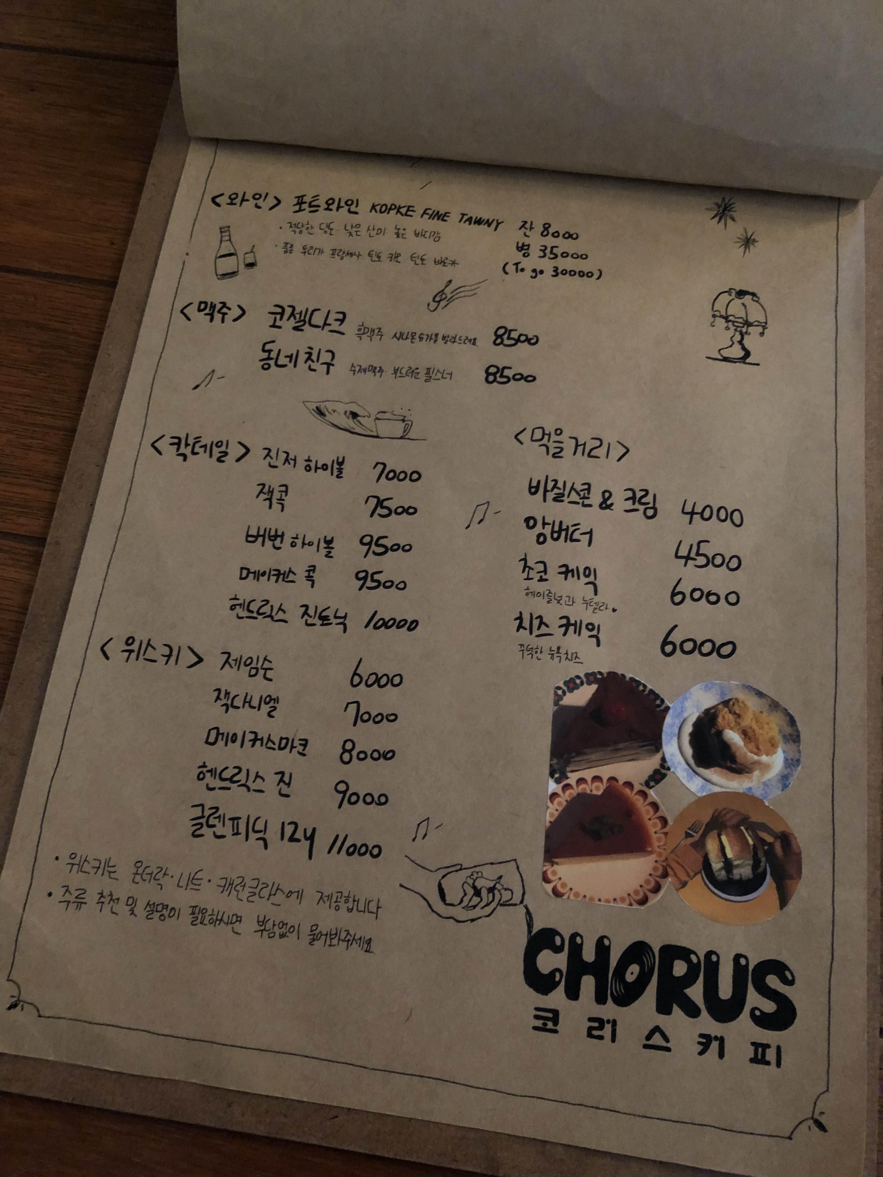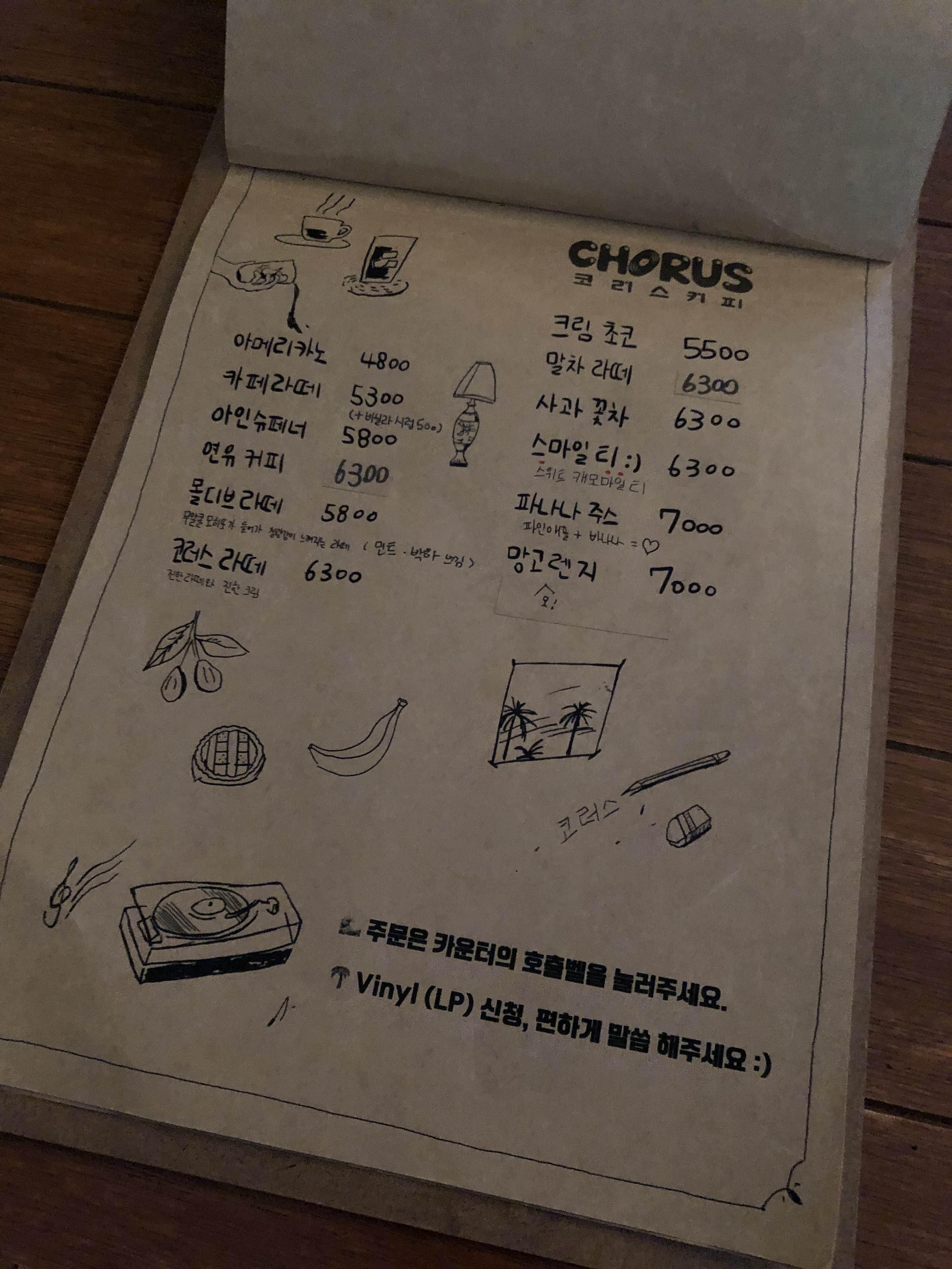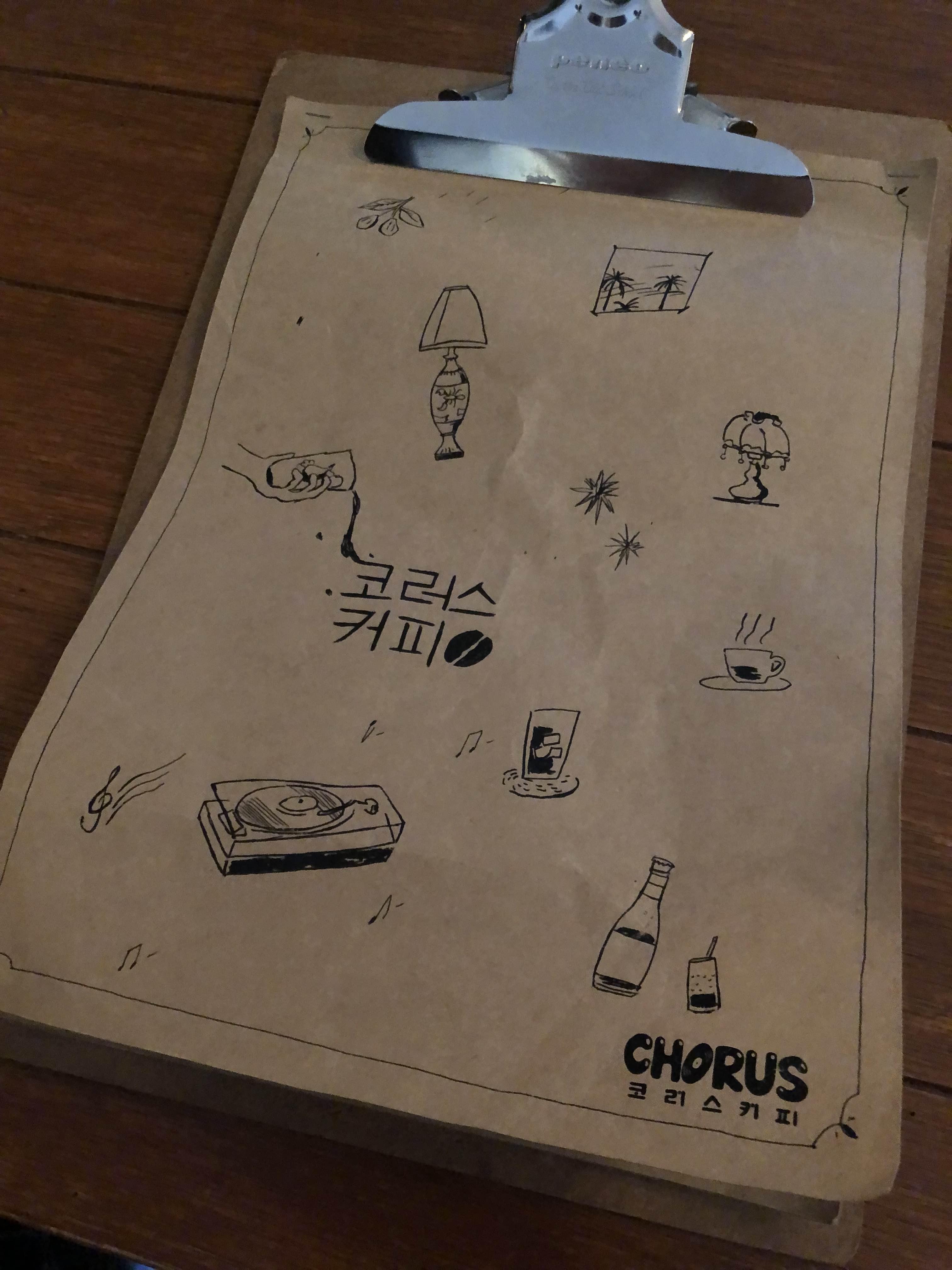 메뉴판 표지의 그림들이 참 코러스커피를 잘 나타내는 귀여운 그림인듯영!