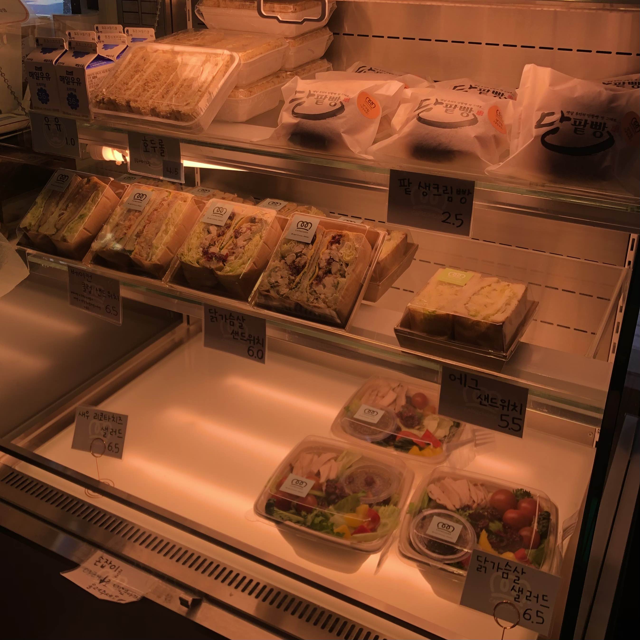 계산대 옆에는 이렇게 샐러드랑 샌드위치도 있어요.