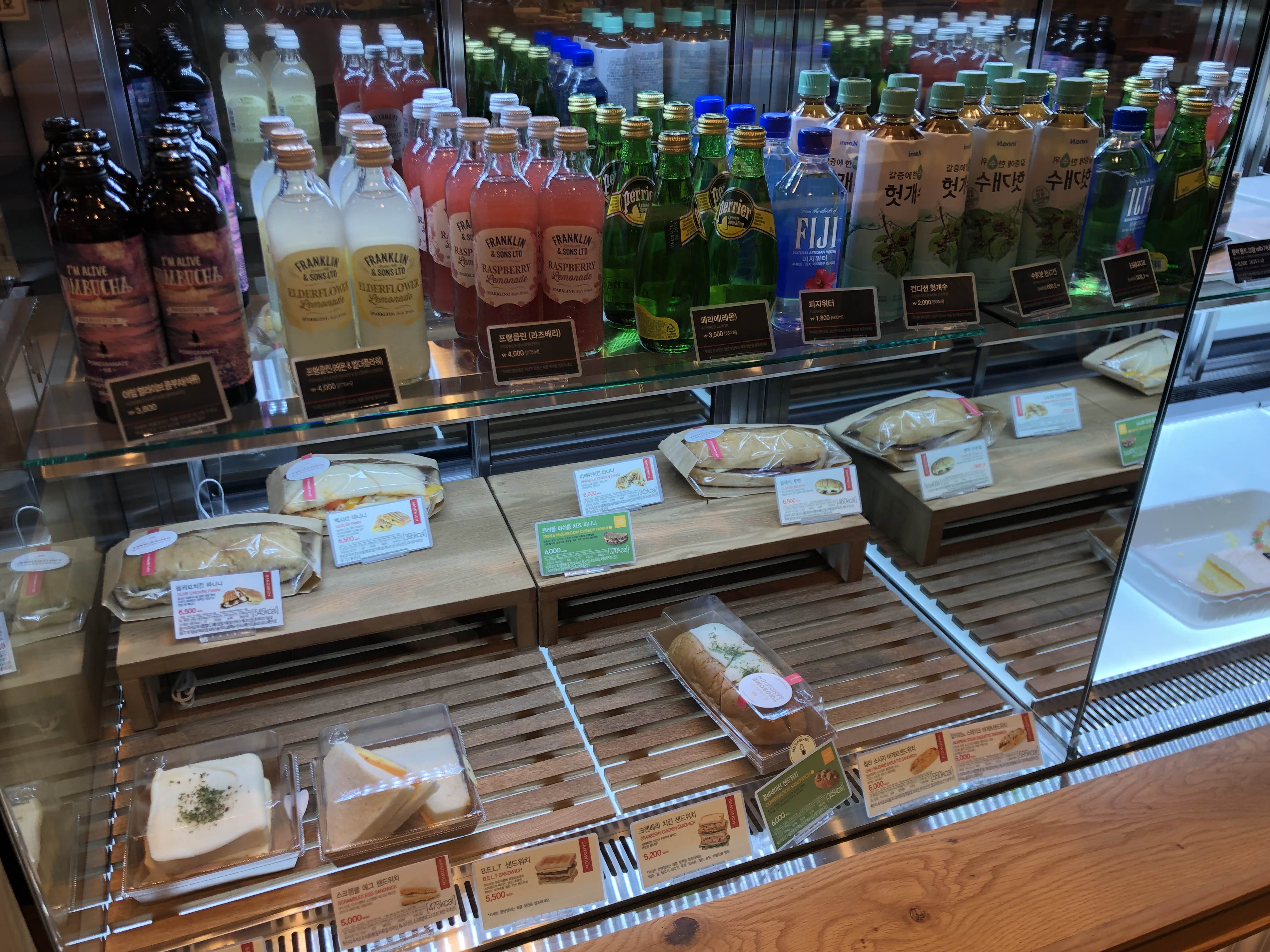 쇼케이스에 각종 음료와 빵 샌드위치류도 종류가 많았어요.