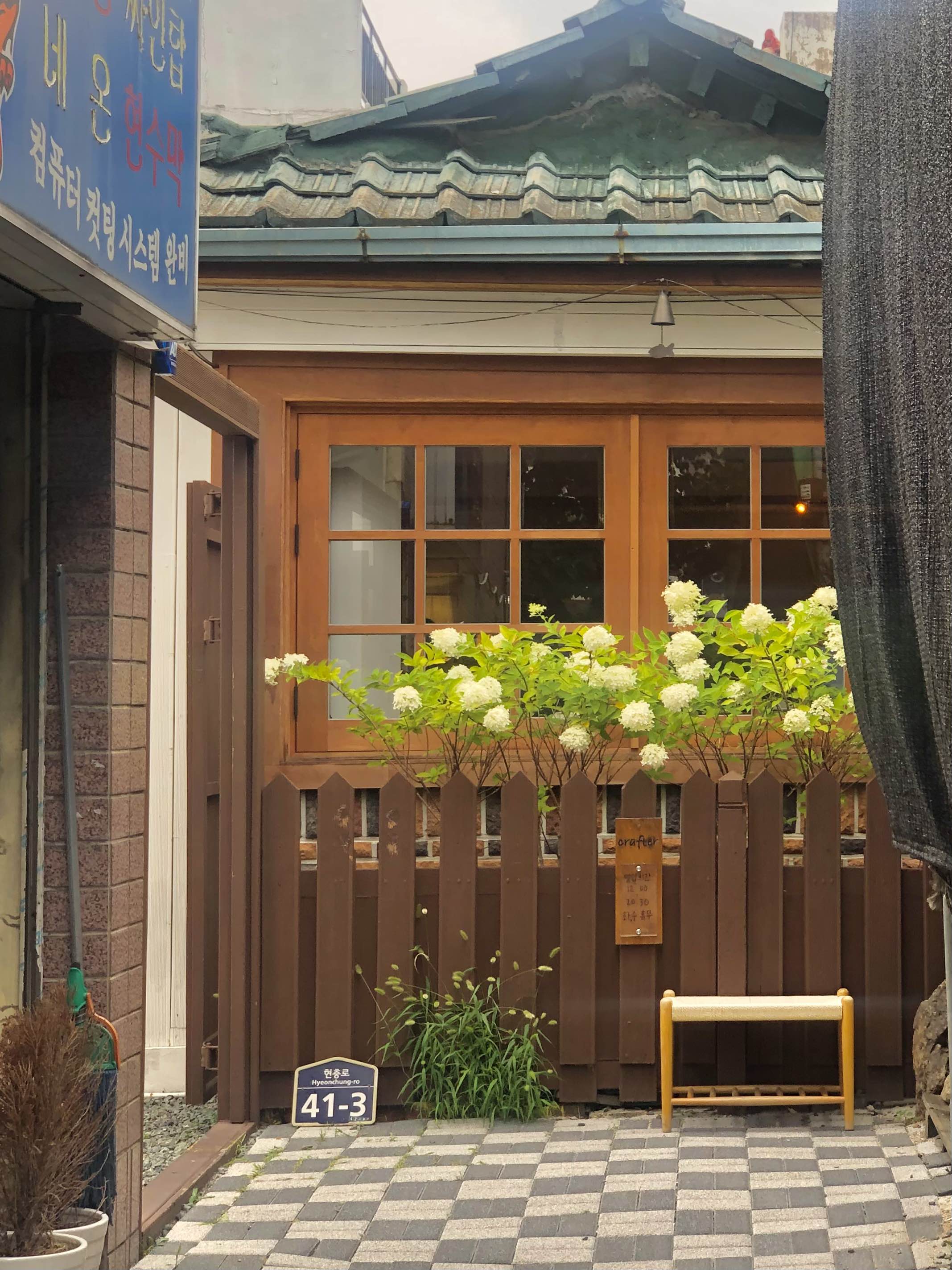 개조한 한옥 건물과 환하게 피어있는 꽃이 너무 예쁜 모습이죠.