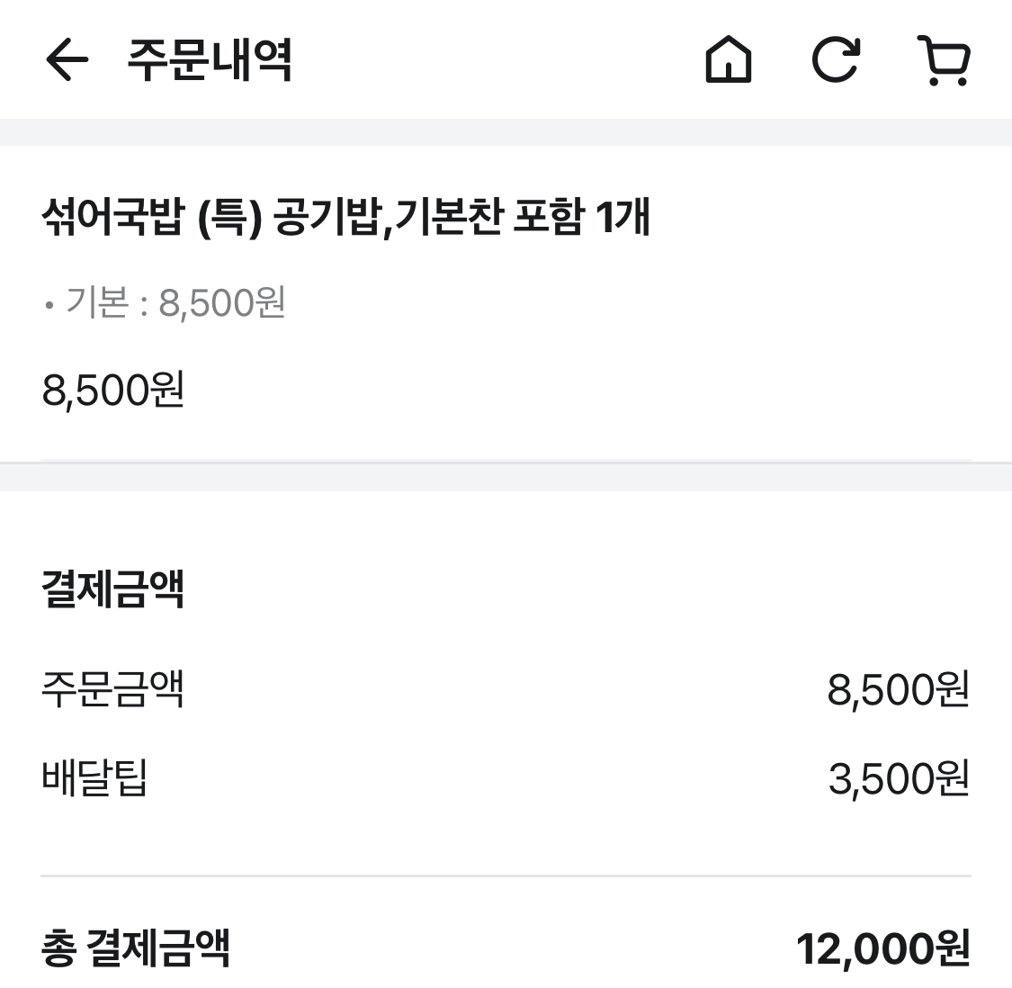 배달비 포함 총 12,000원 결제했어요.