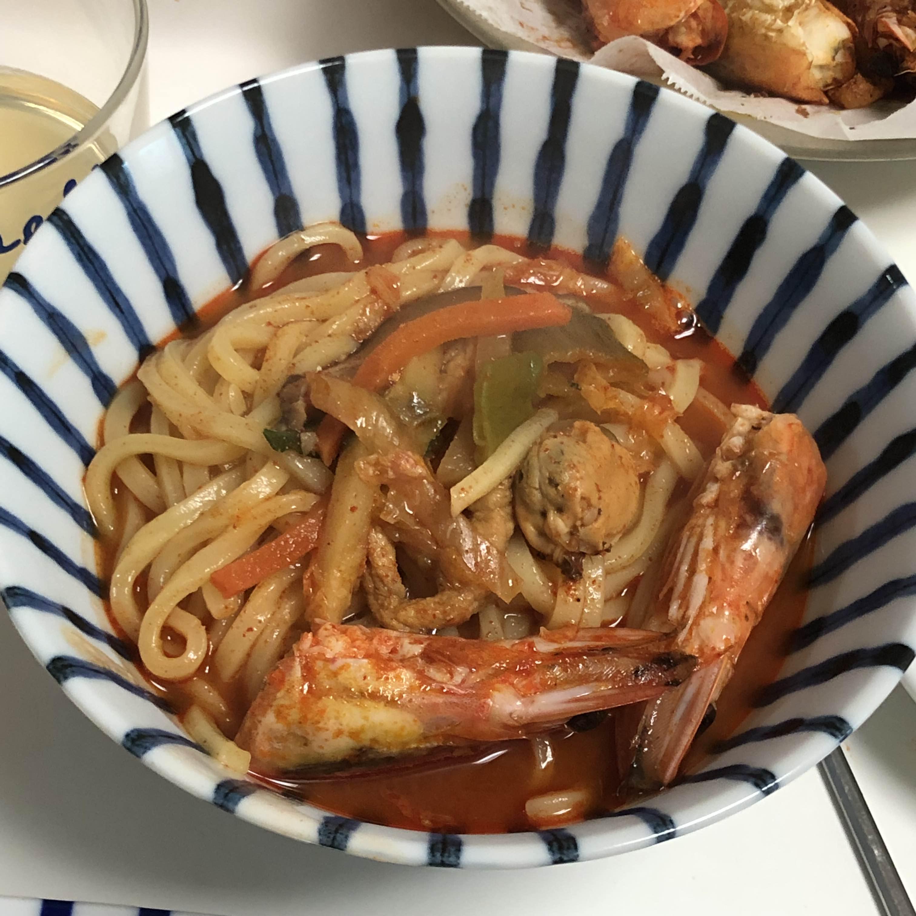 실컷 먹고 남은 새우 대가리 몇 개 짬뽕에 넣어서 같이 끓여줬어요.