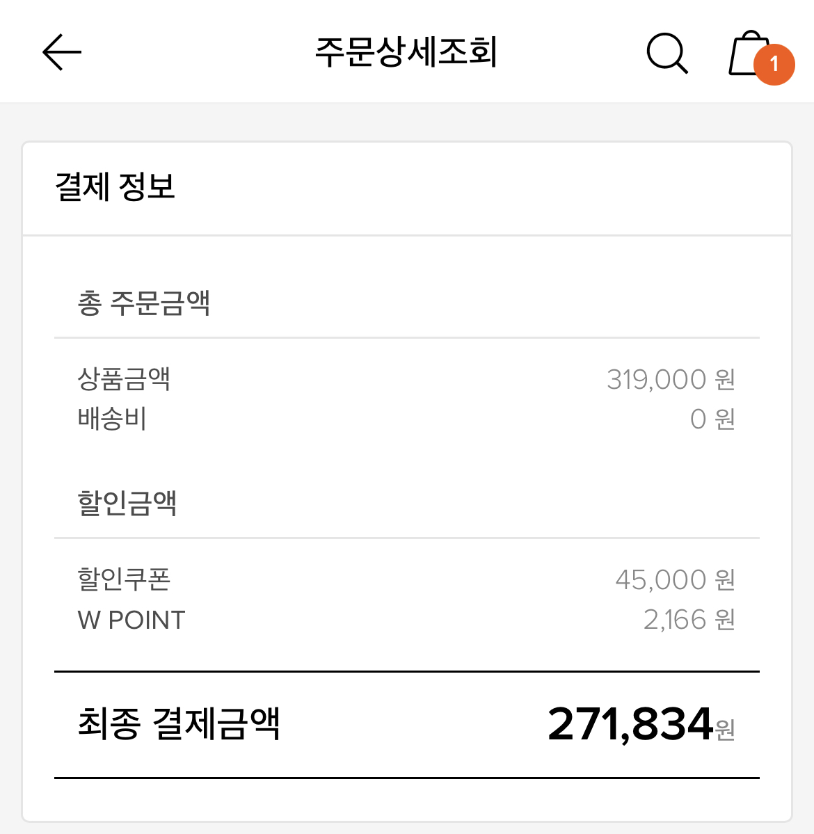 할인쿠폰에 포인트까지 써서 총 271,834원에 구입했어요.