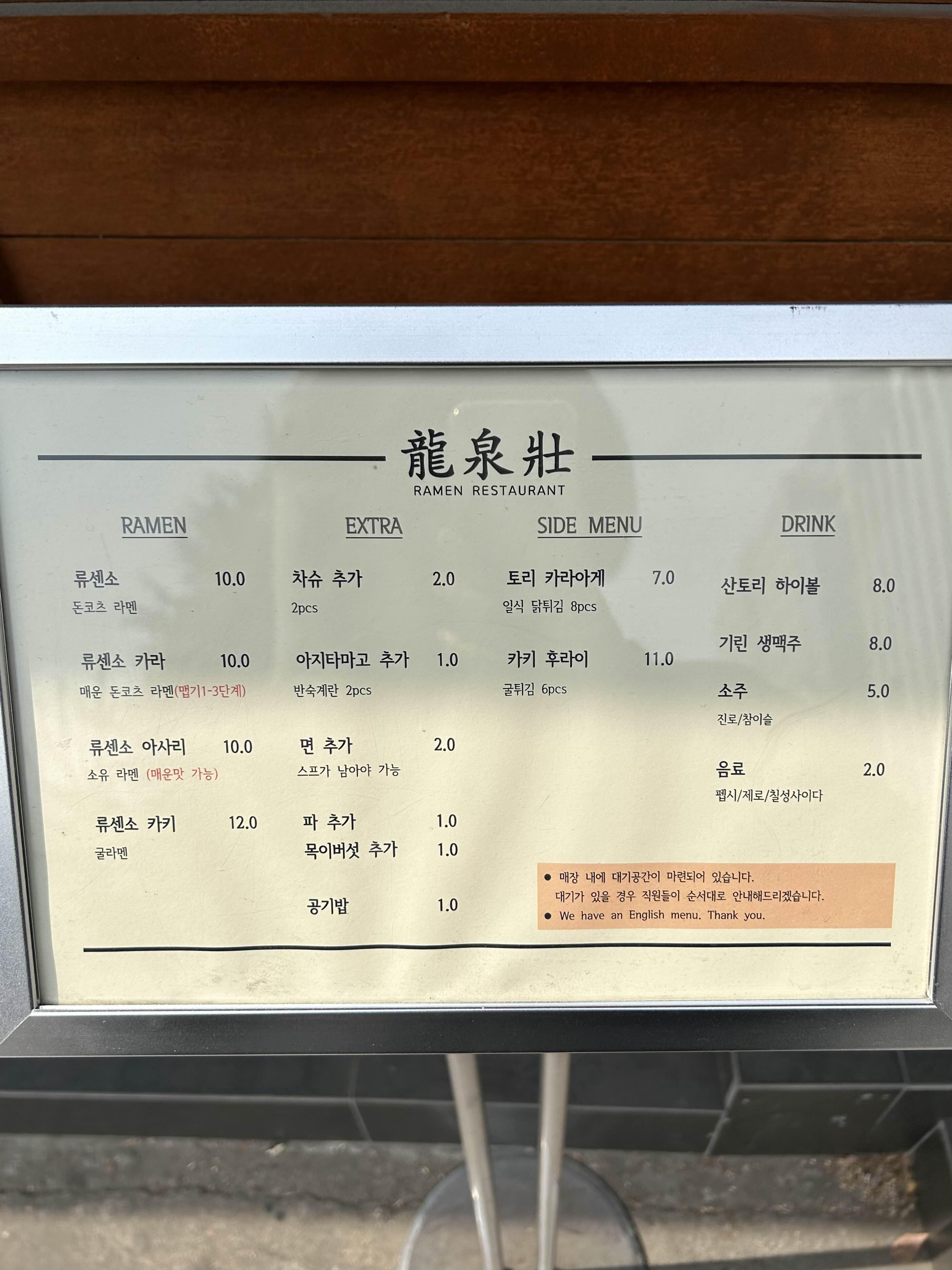 가게 입구 옆에 이렇게 메뉴판이 있었어요.