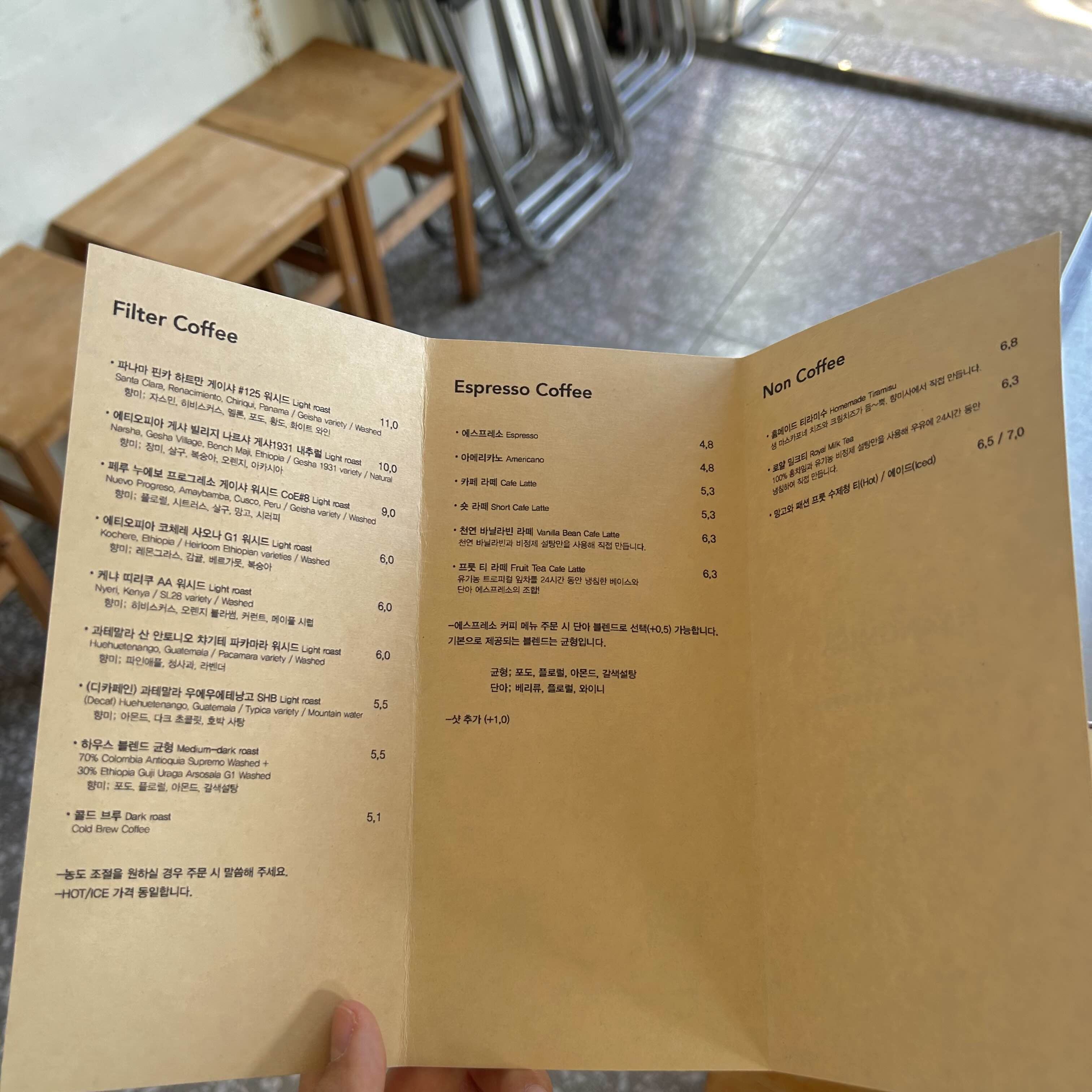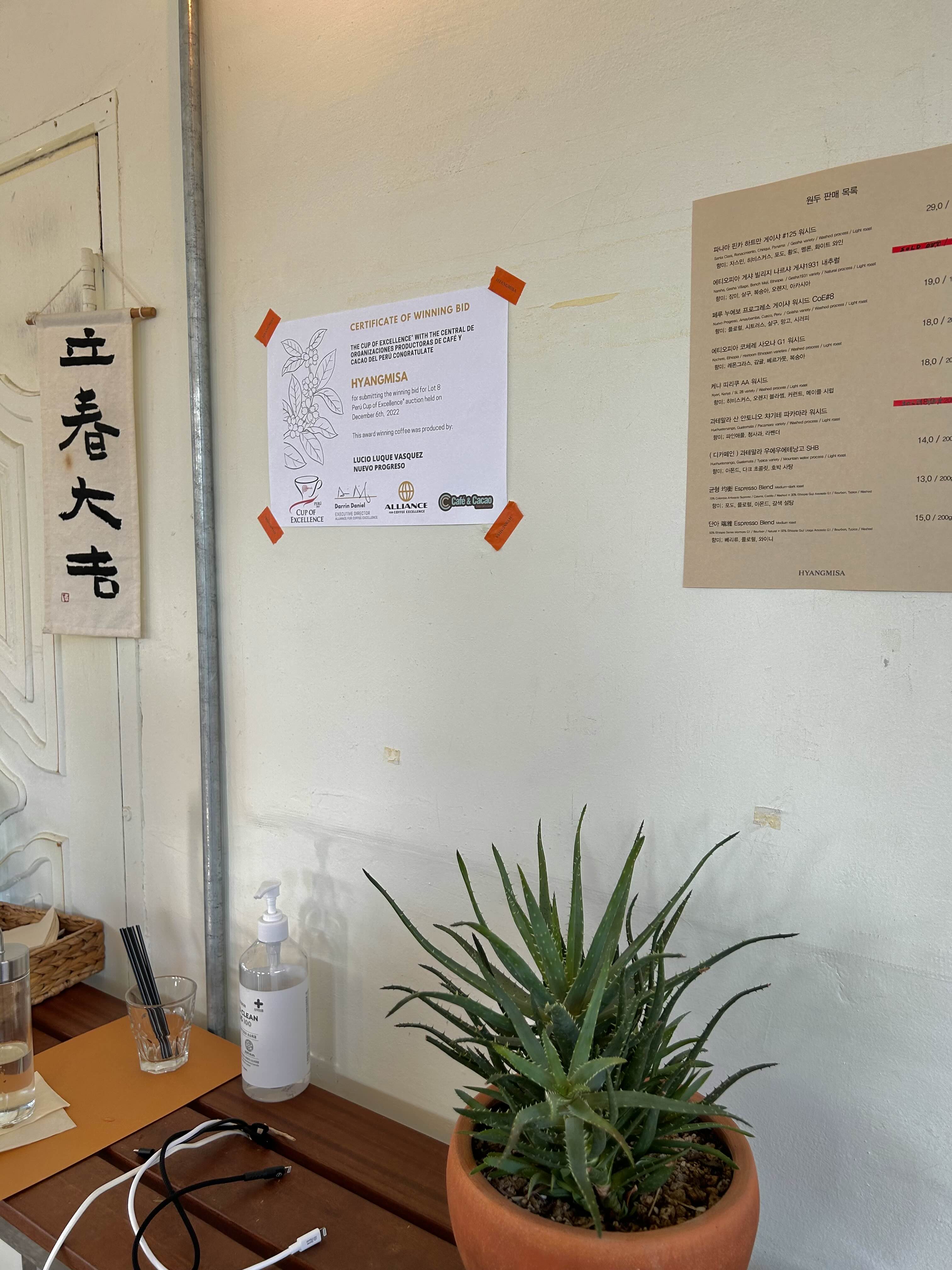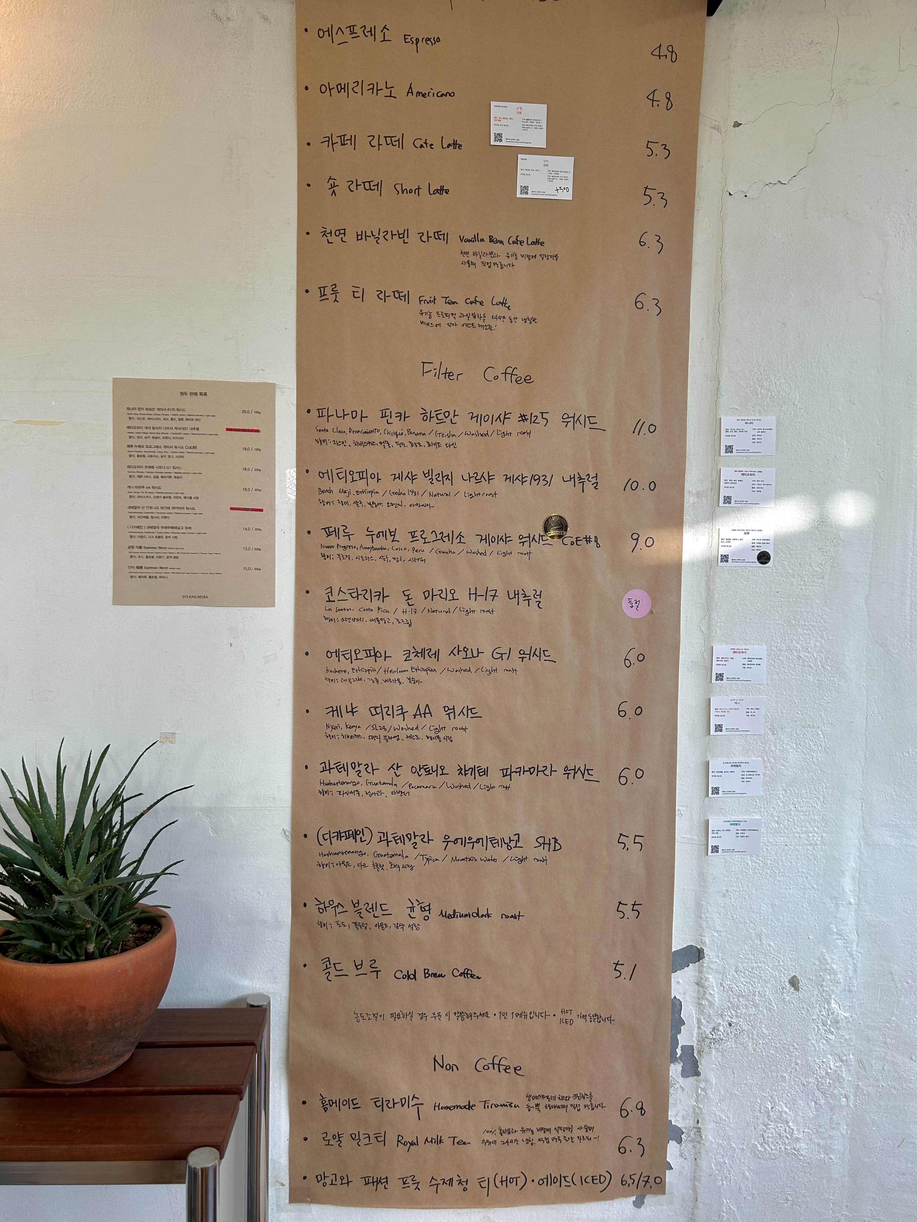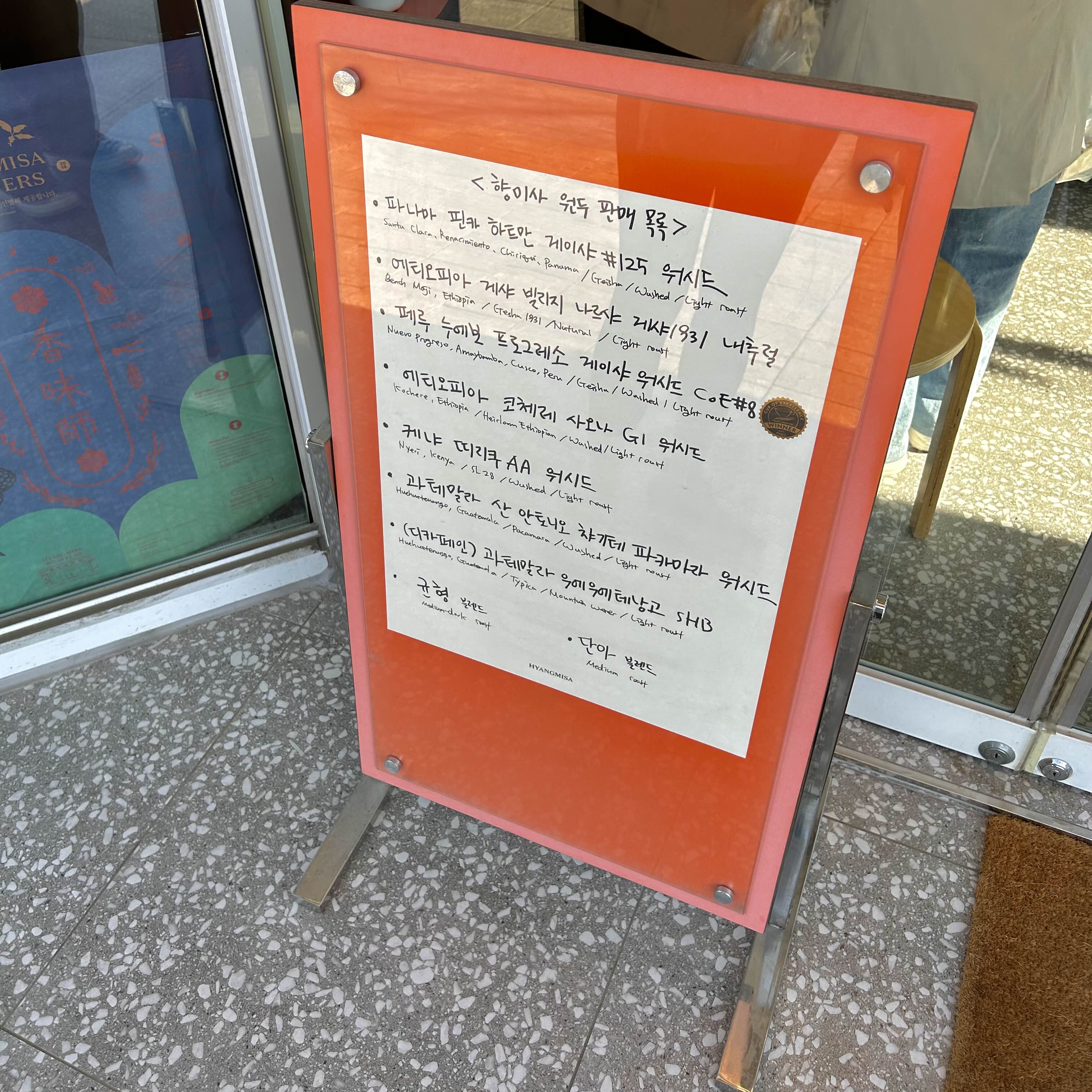입구 앞엔 이렇게 판매 중인 원두 리스트를 안내 해두셨네요.