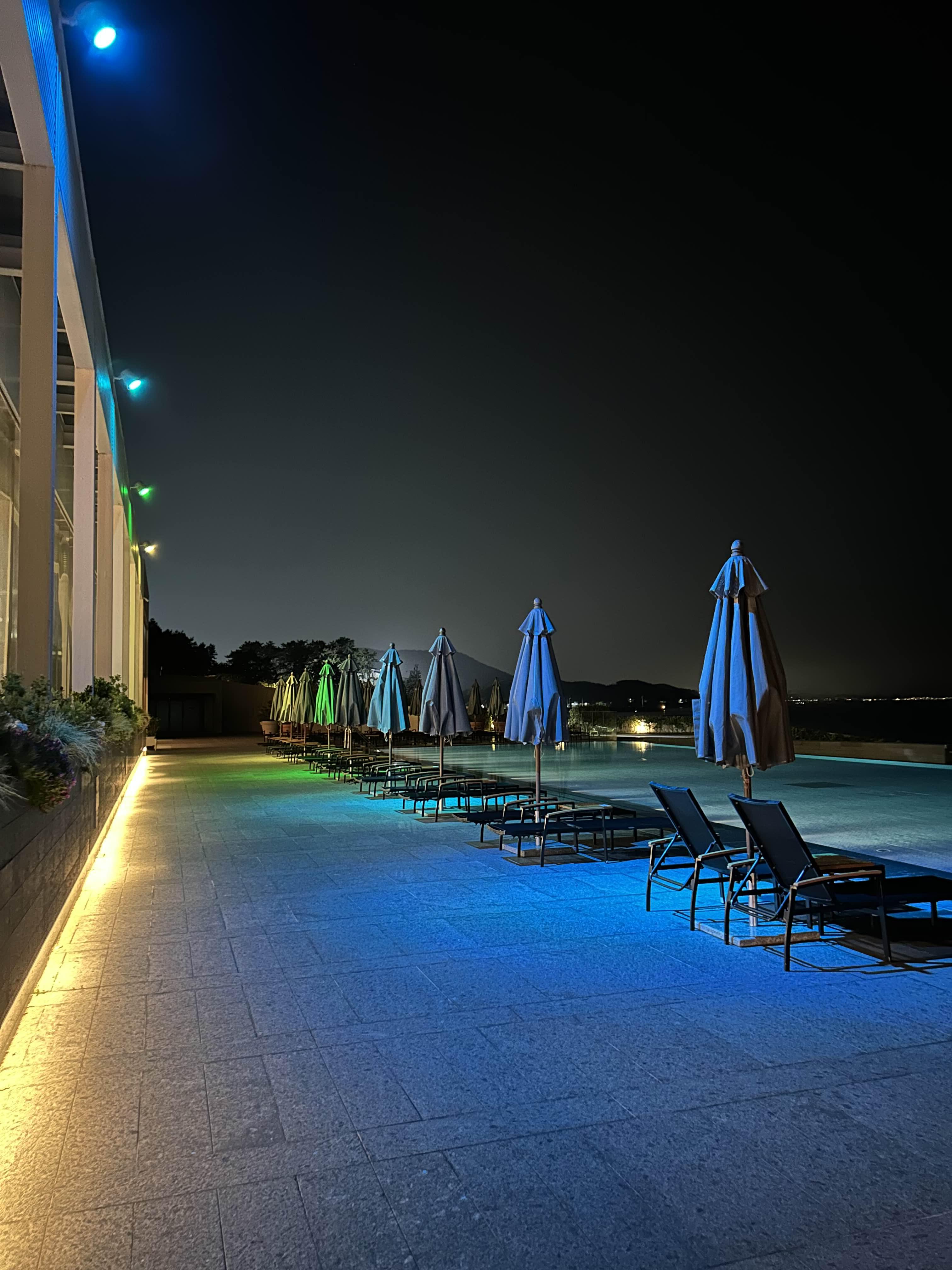 조명 켜진 수영장 뷰가 참 분위기 있어요.