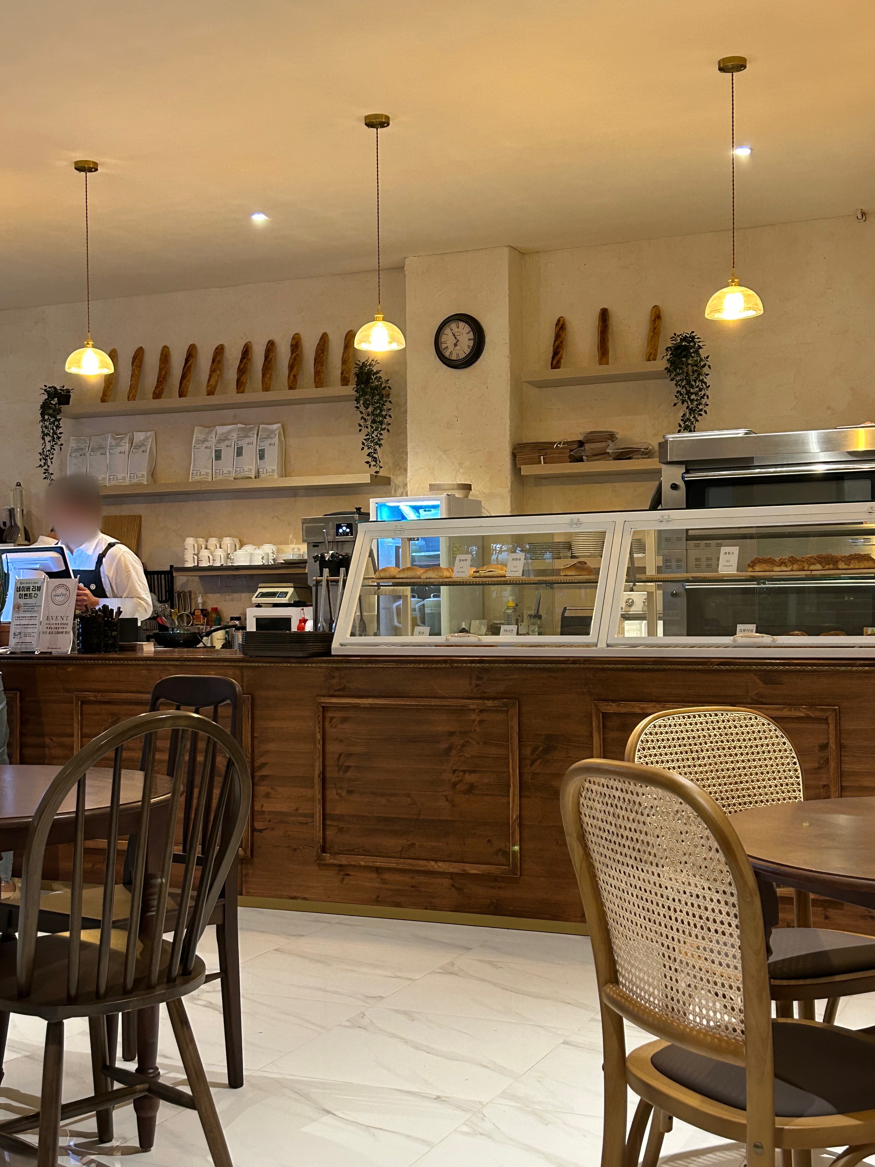 카운터 뒤편으로 늘어서 있는 바게트들이 인상적이에요.