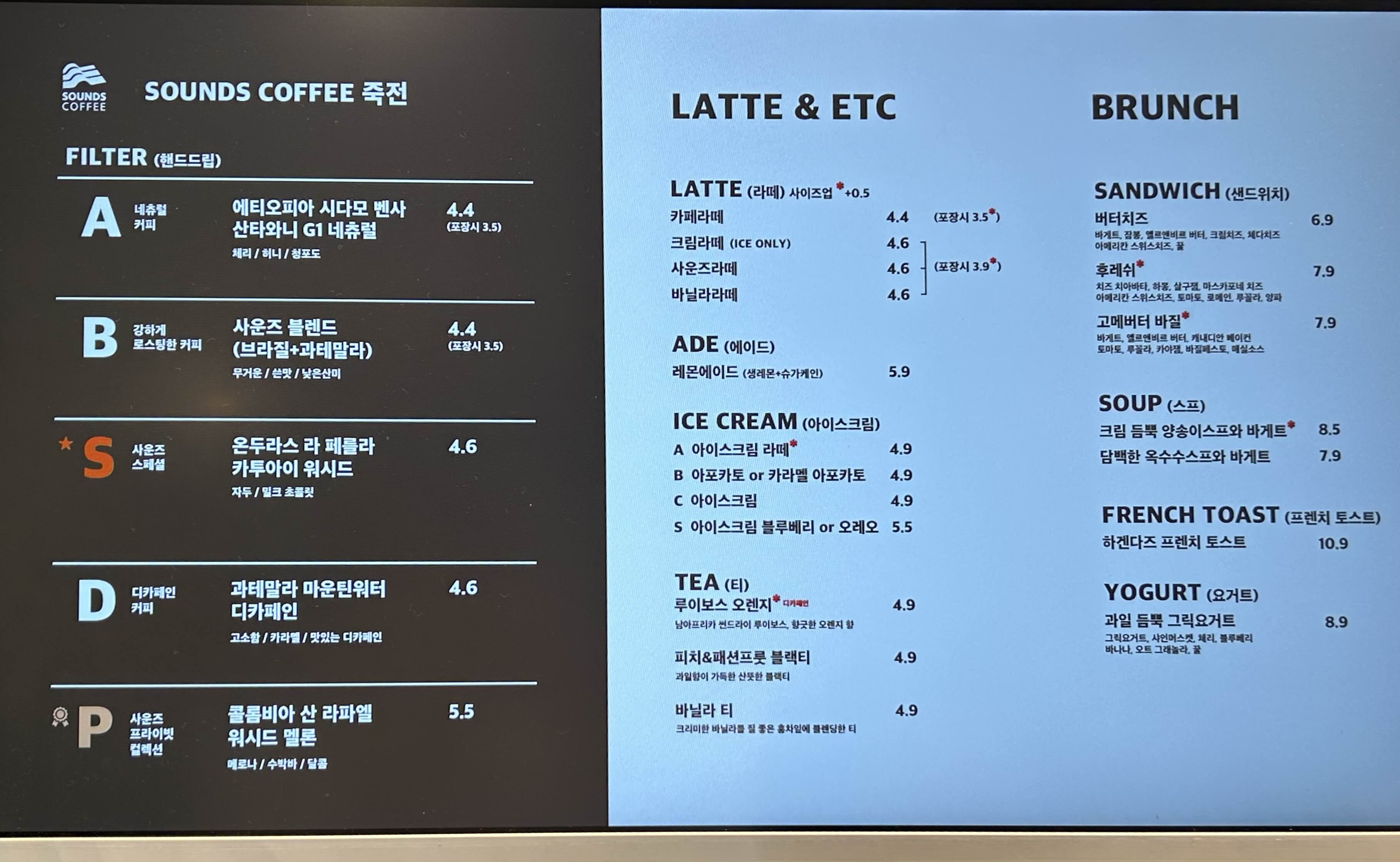 사운즈커피 메뉴판이에요.