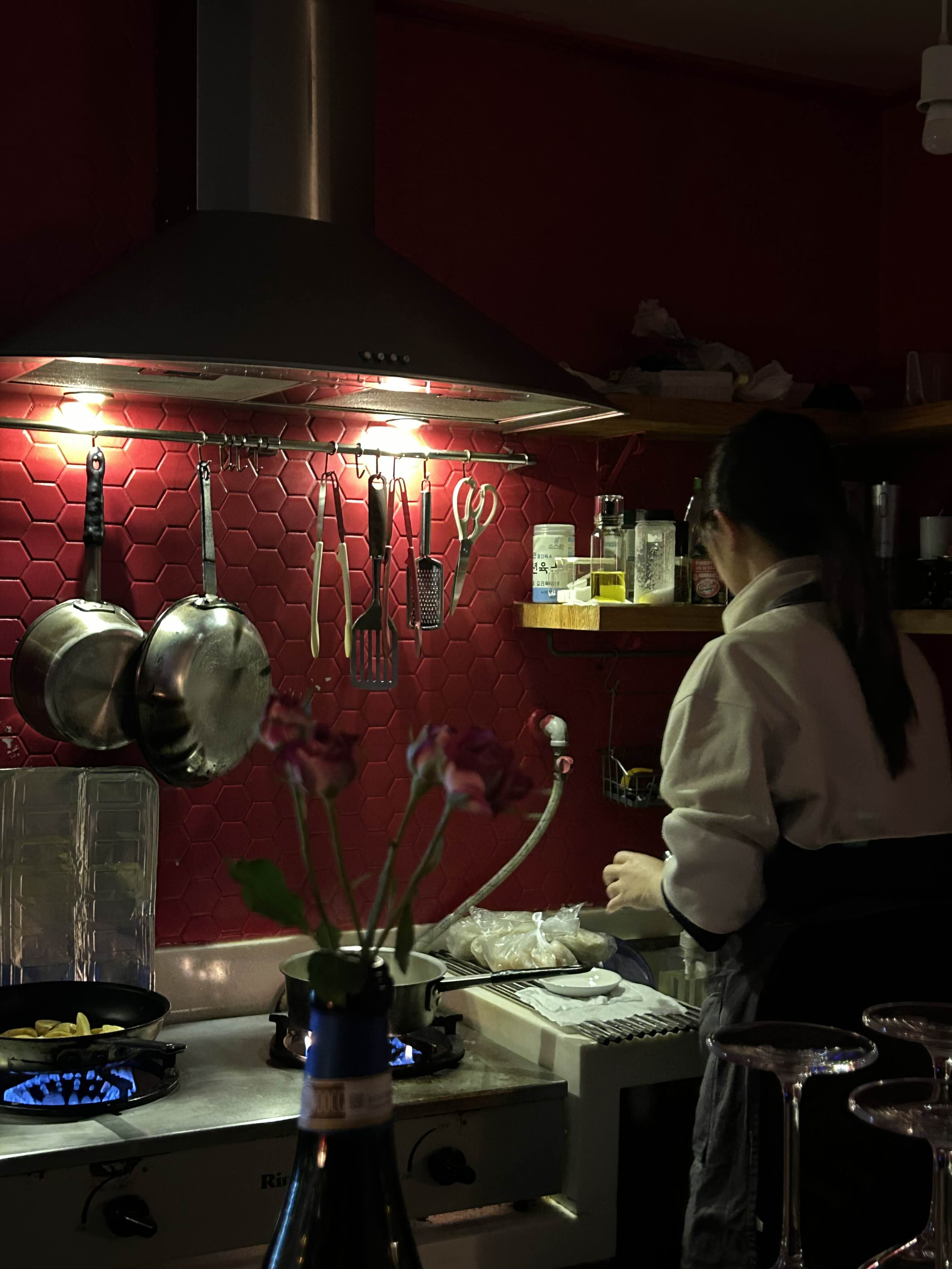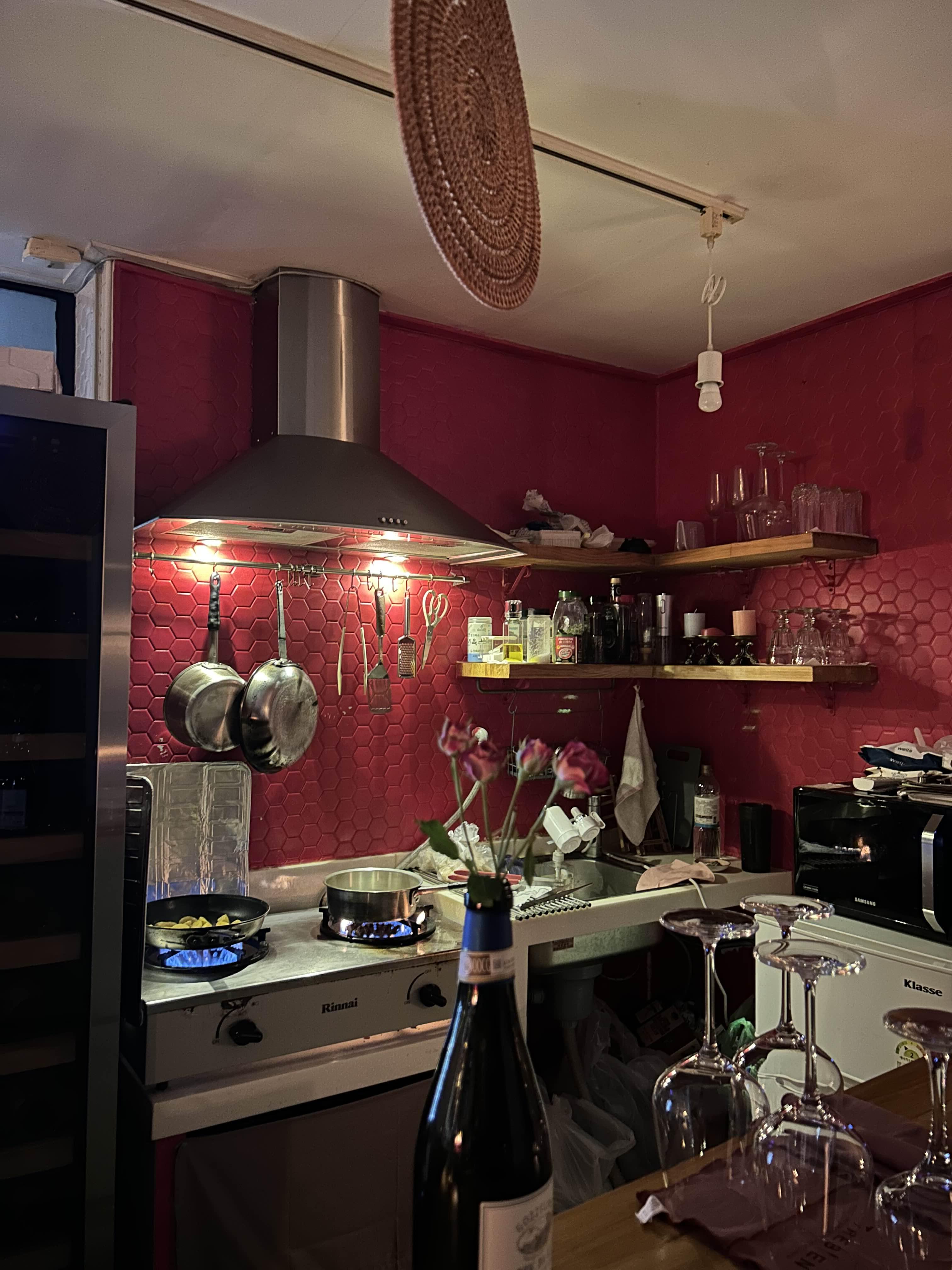 새빨간 타일 벽 키친이 너무 예뻐요.