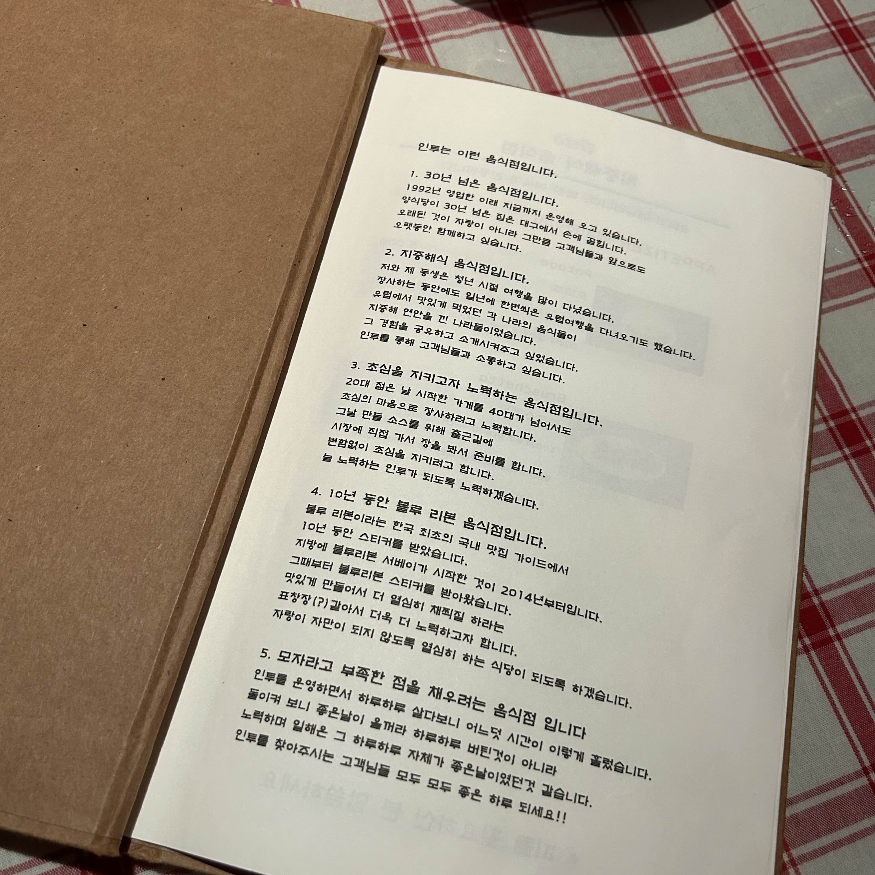 메뉴판 첫 장부터 가게에 대한 소개 글이 정성스레 적혀 있었어요.