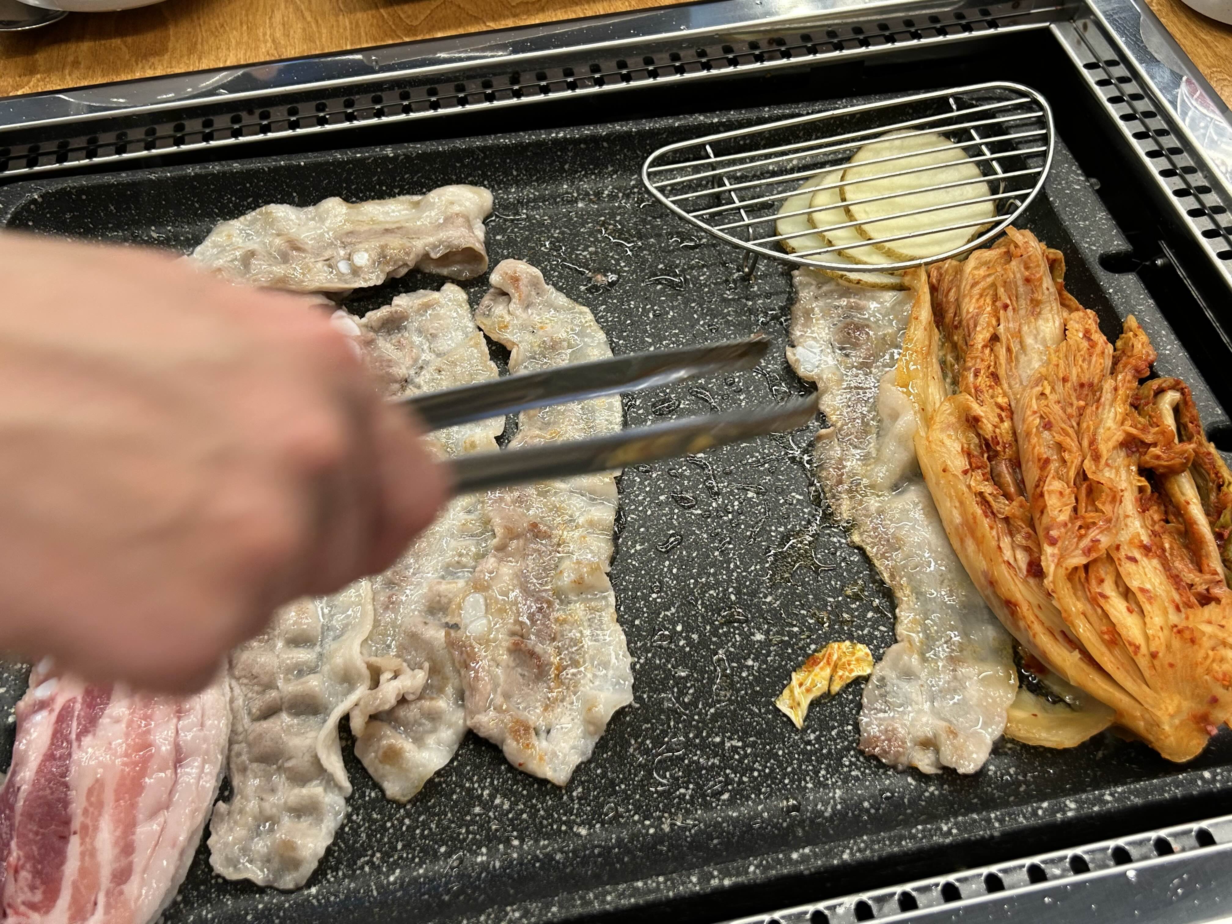 프로페셔널하게 집게로 얇은 생대패 하나하나 떼어내서 잘 구워주심요. ㅎㅎ