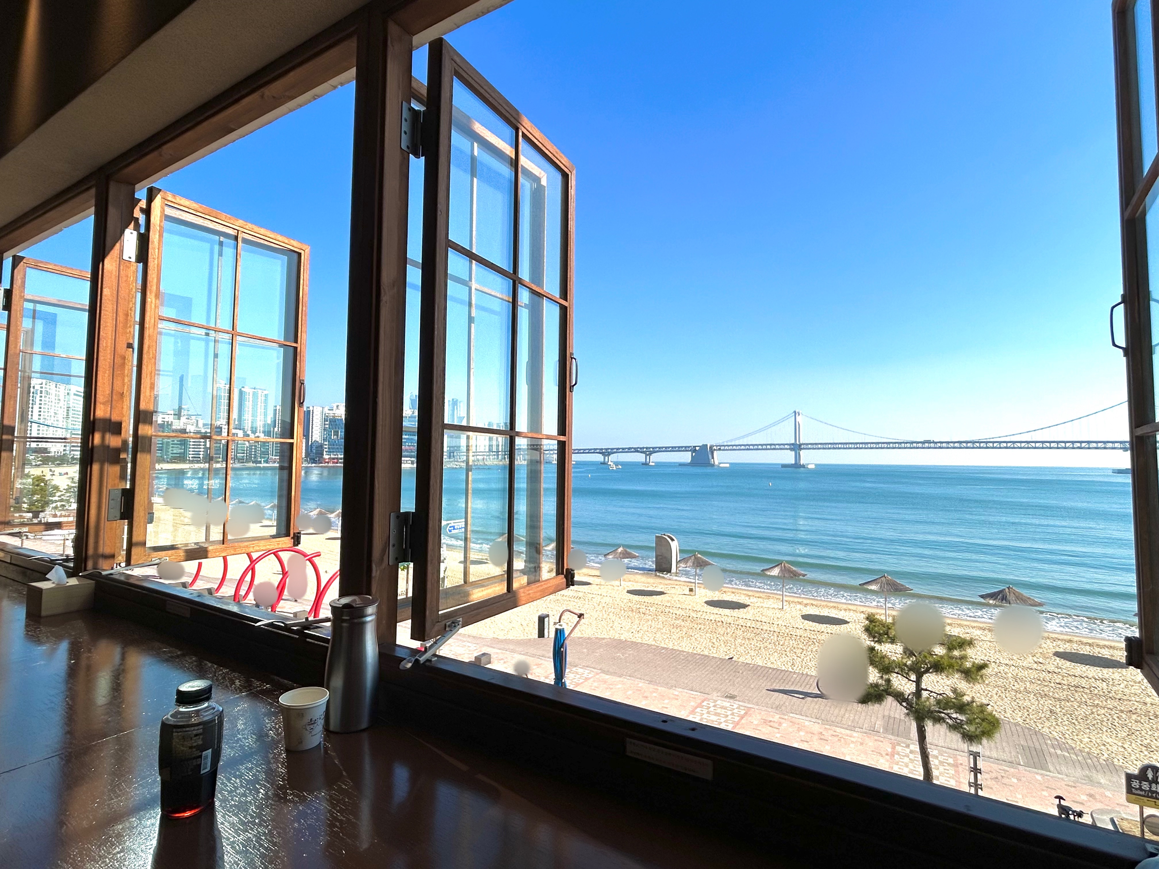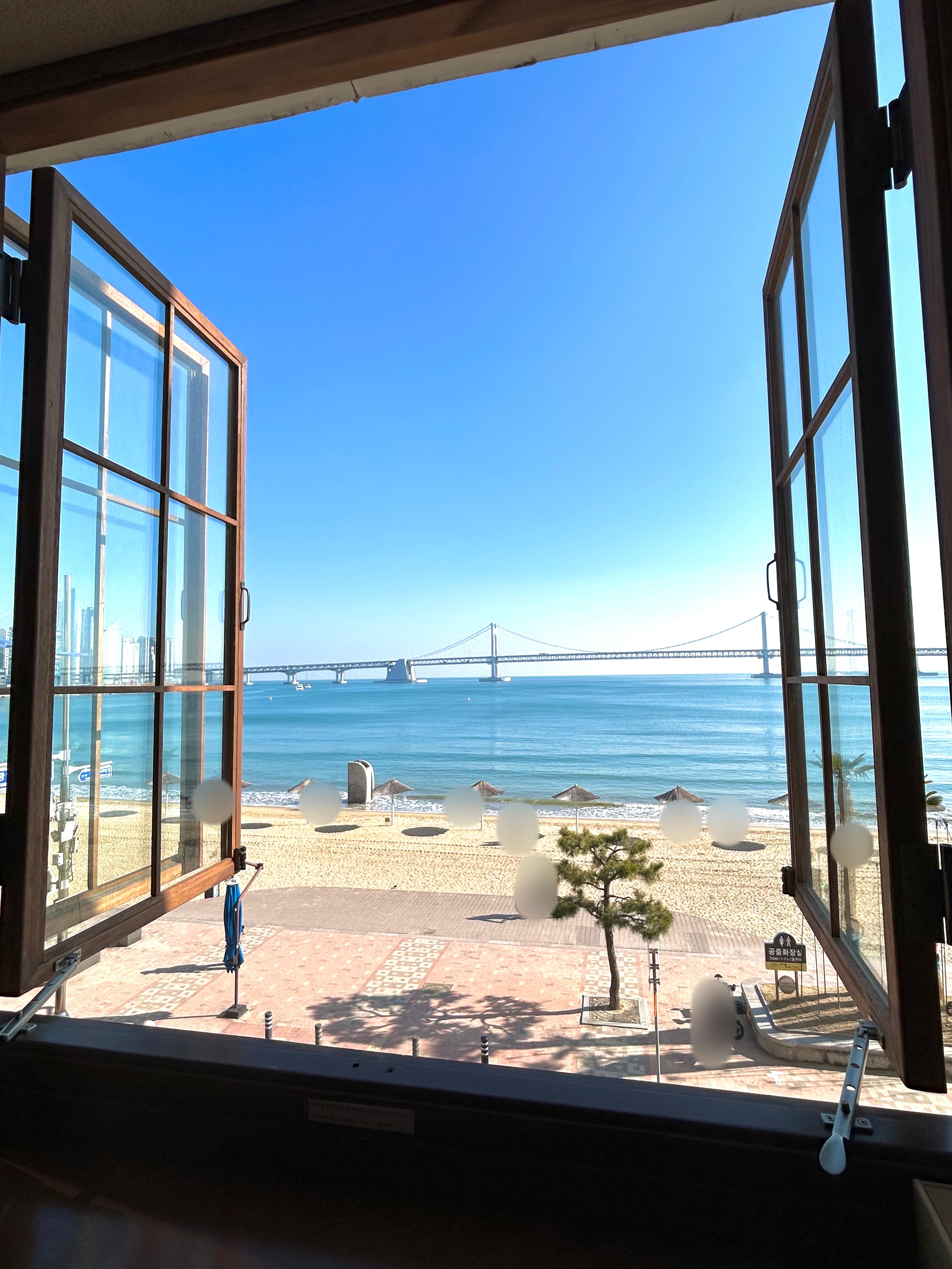 창가 자리에 앉아서 바라보는 탁 트인 광안리 바다 경치가 너무 좋더라구요.