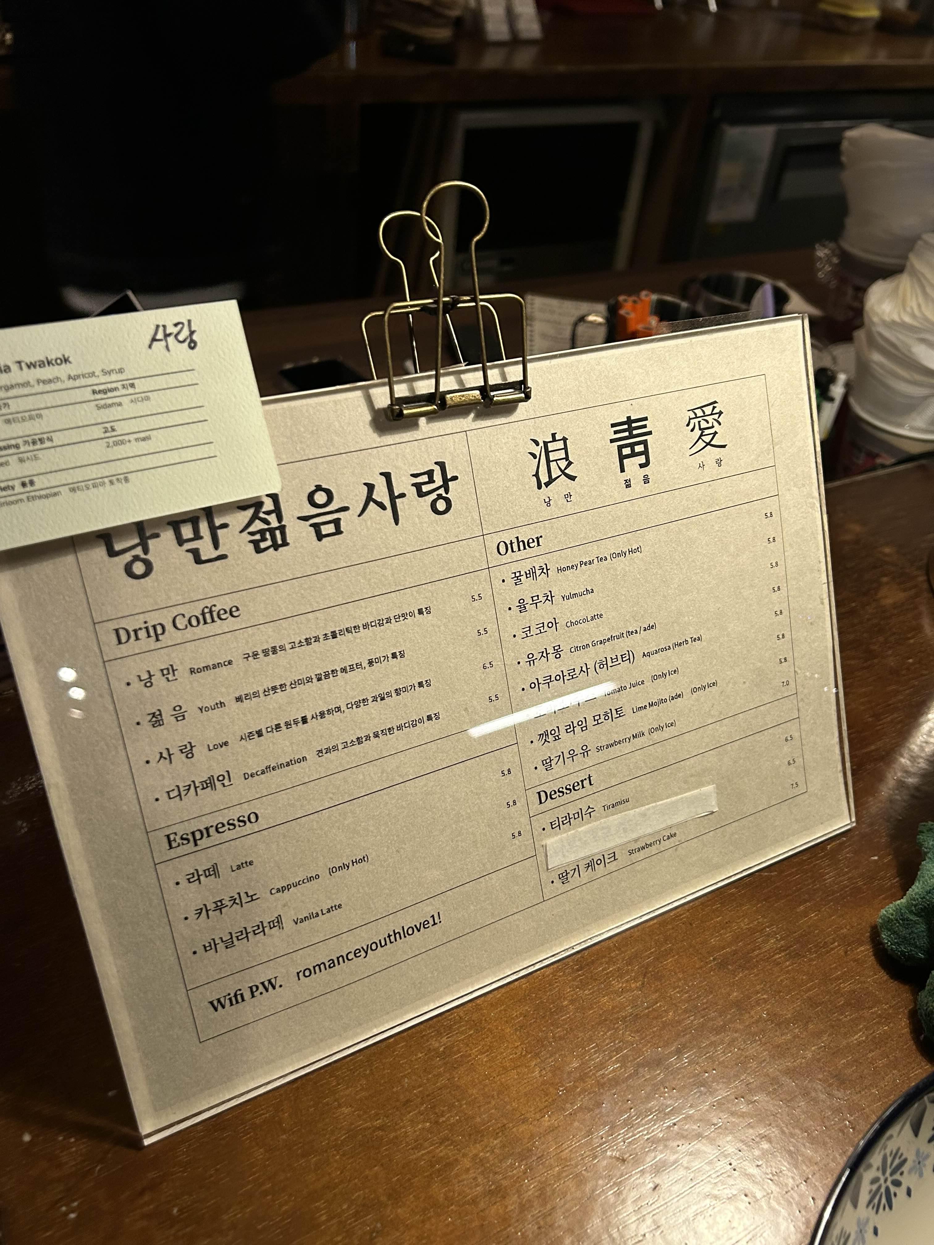 낭만젊음사랑 메뉴판