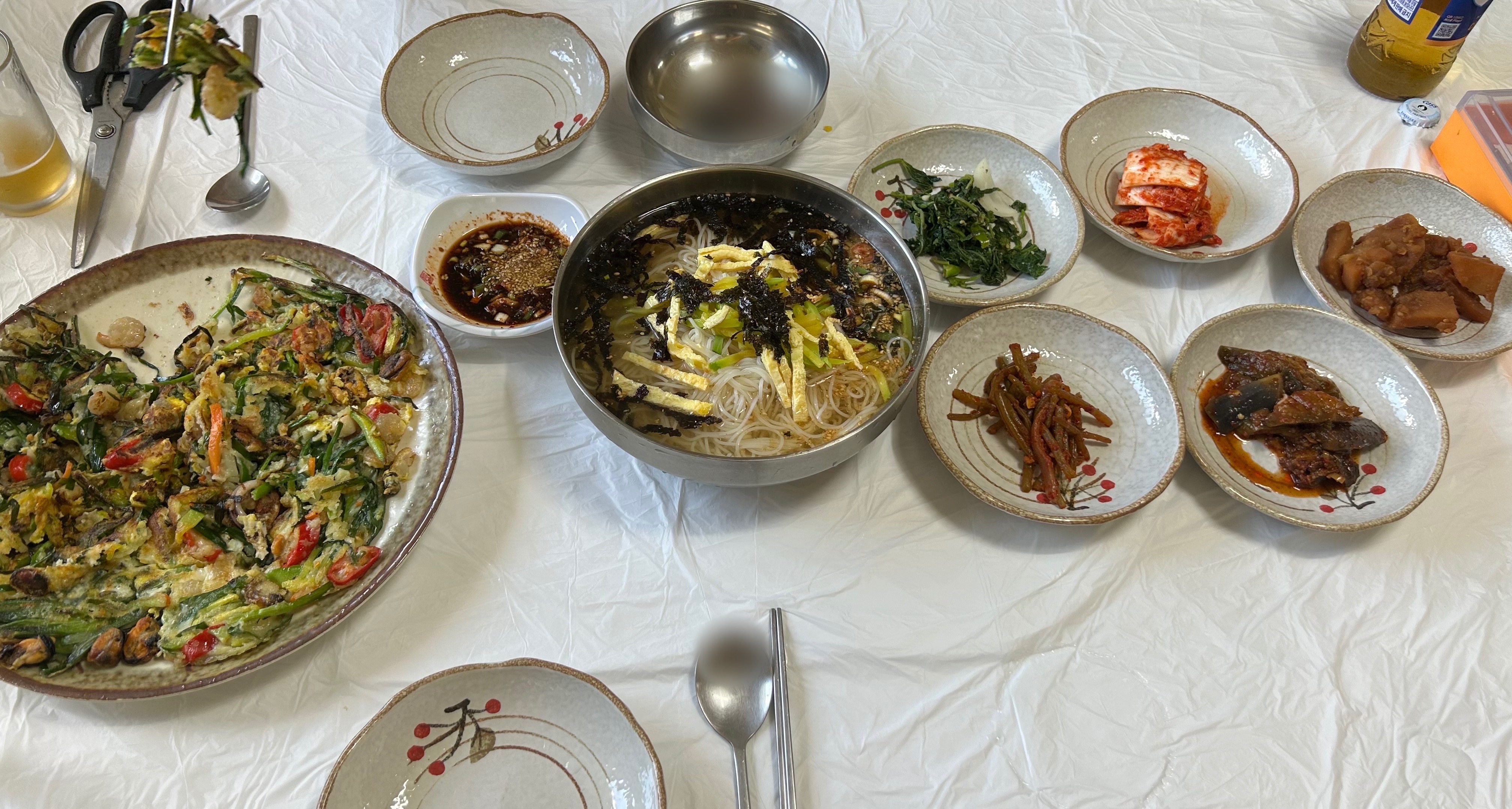 둘이서 파전에 잔치국수 먹으니까 배가 터질 것 같았어요.