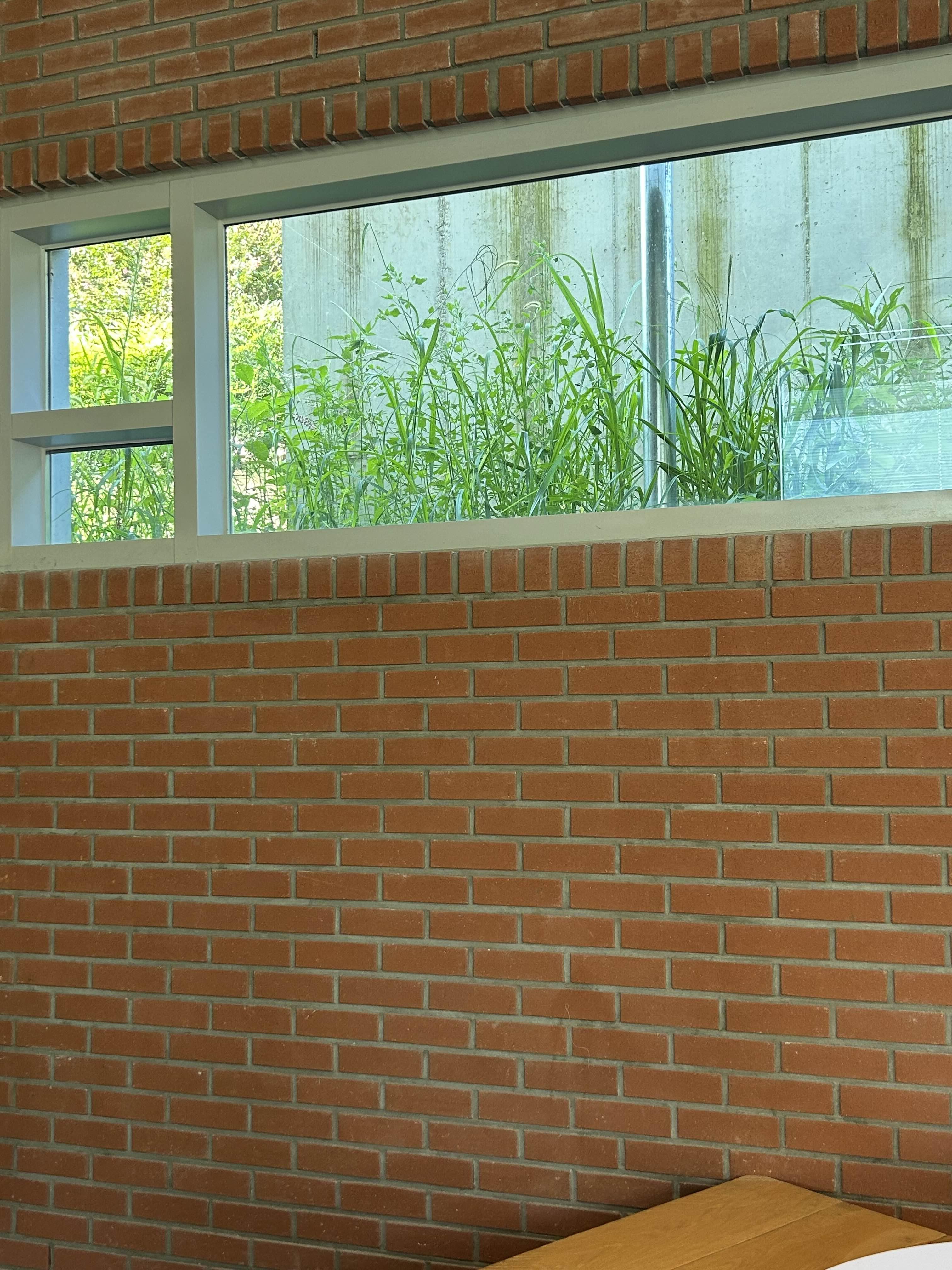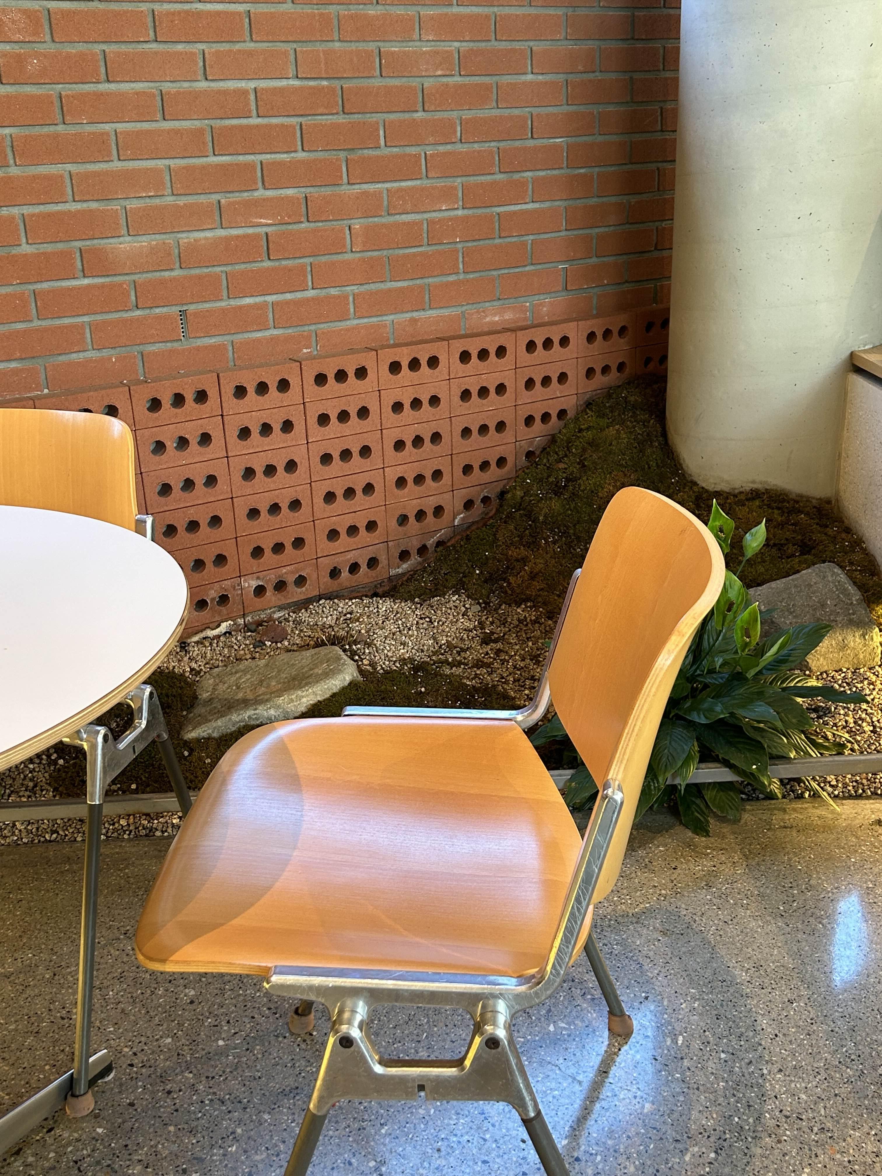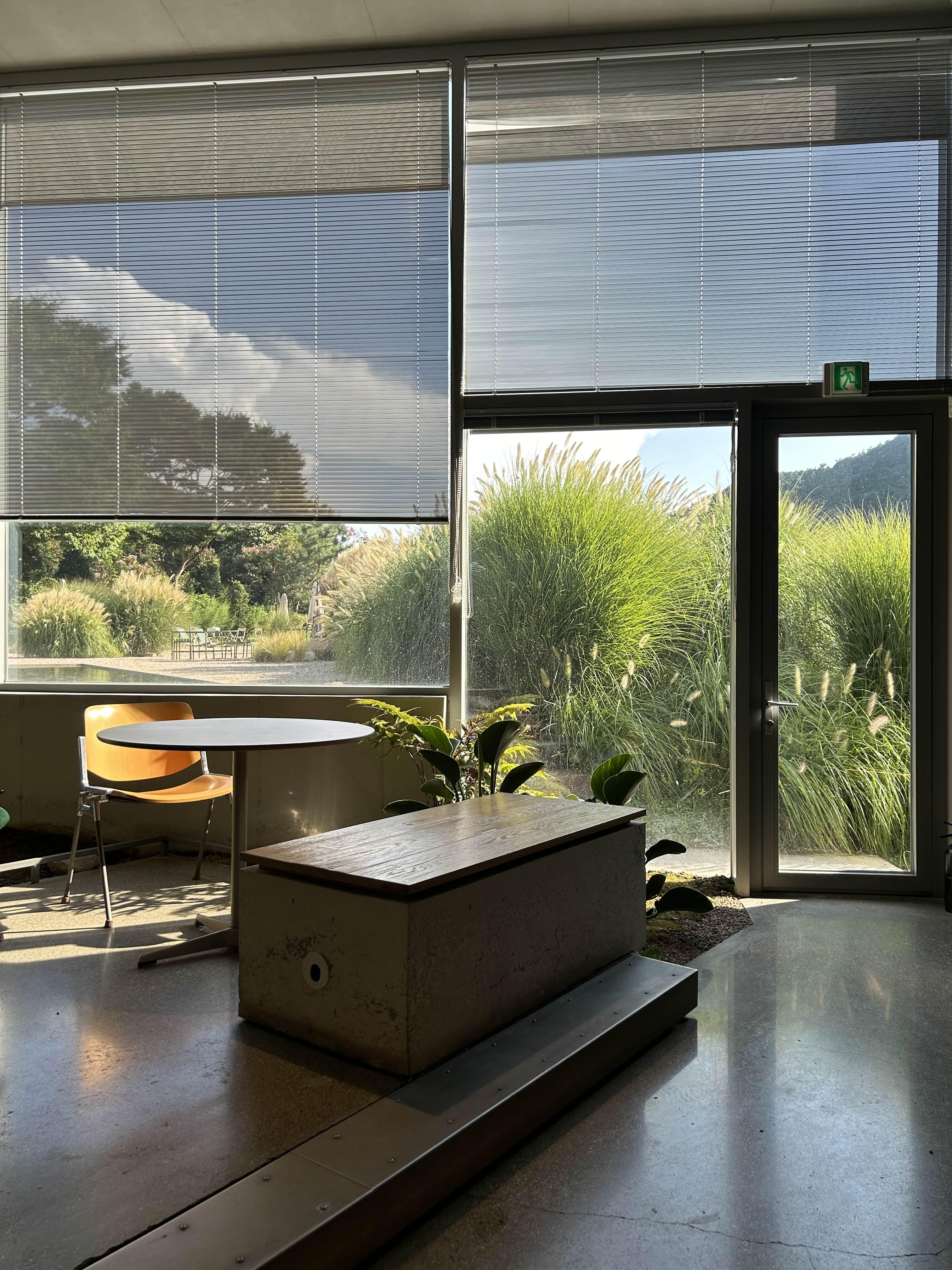 조경과 살짝 들어오는 햇살과 나무재질의 의자가 어우러지는 느낌이 참 좋았어요.