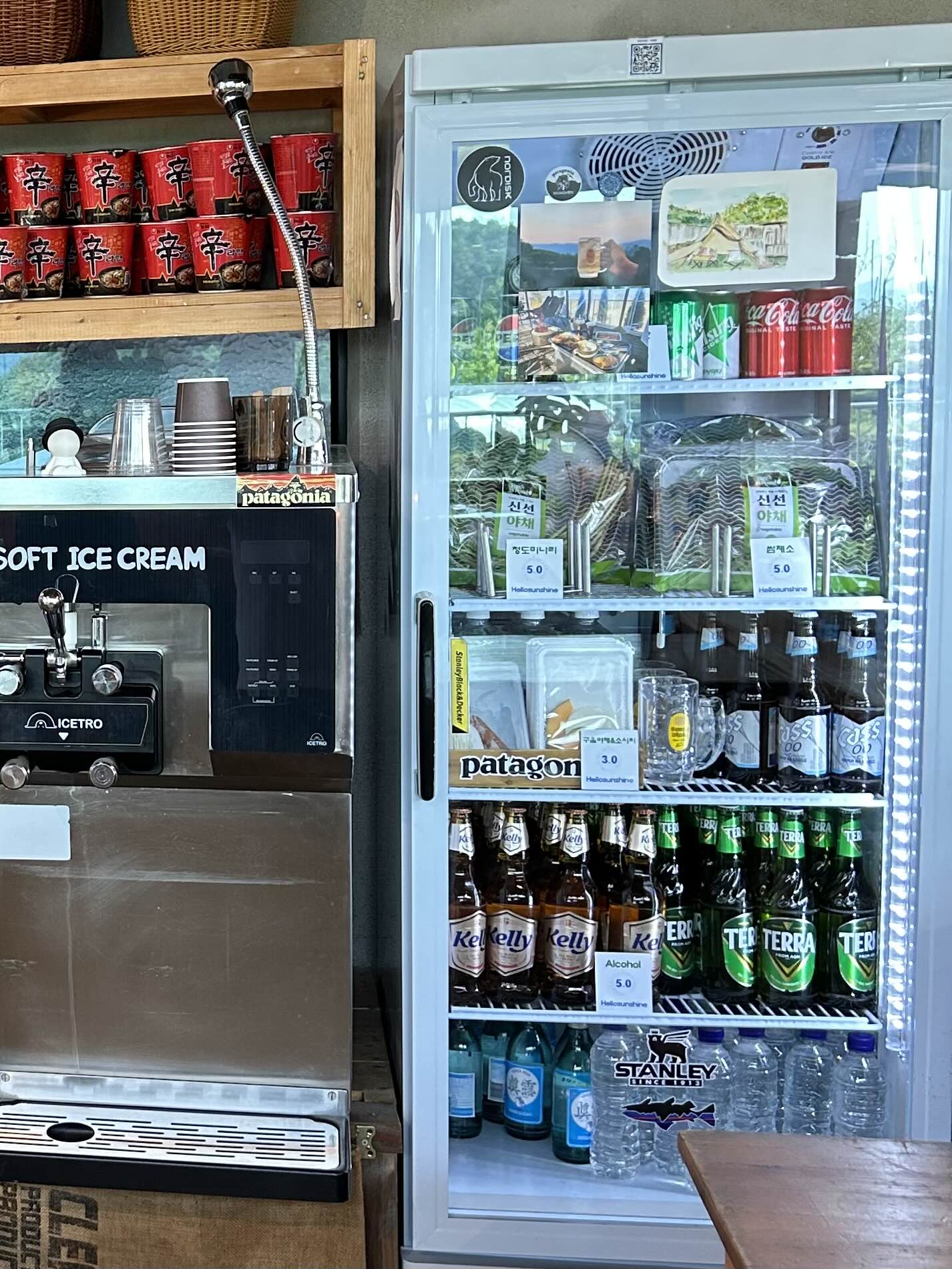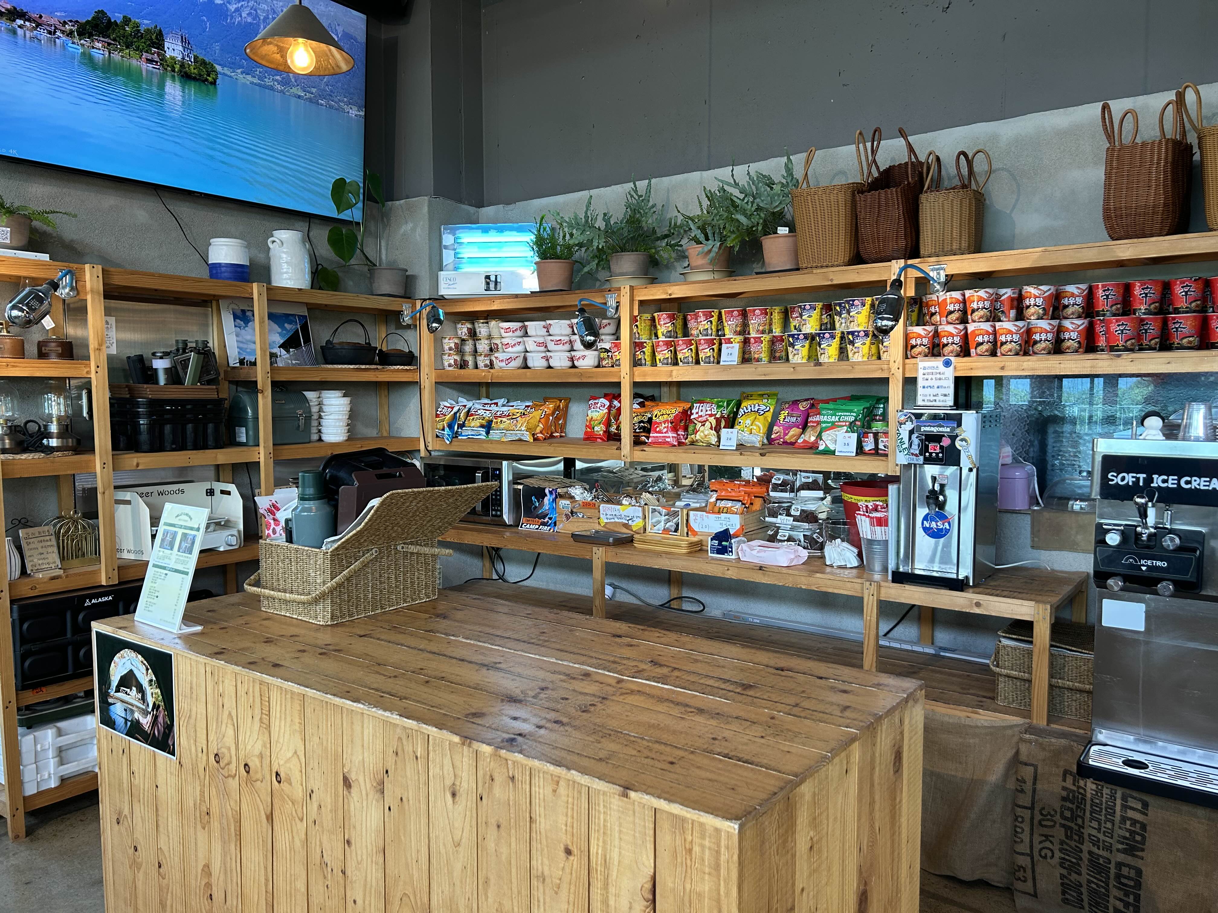 그리고 카운터 바로 옆으로는 캠핑 이용 고객들을 위한 식품과 물품들이 있어요.