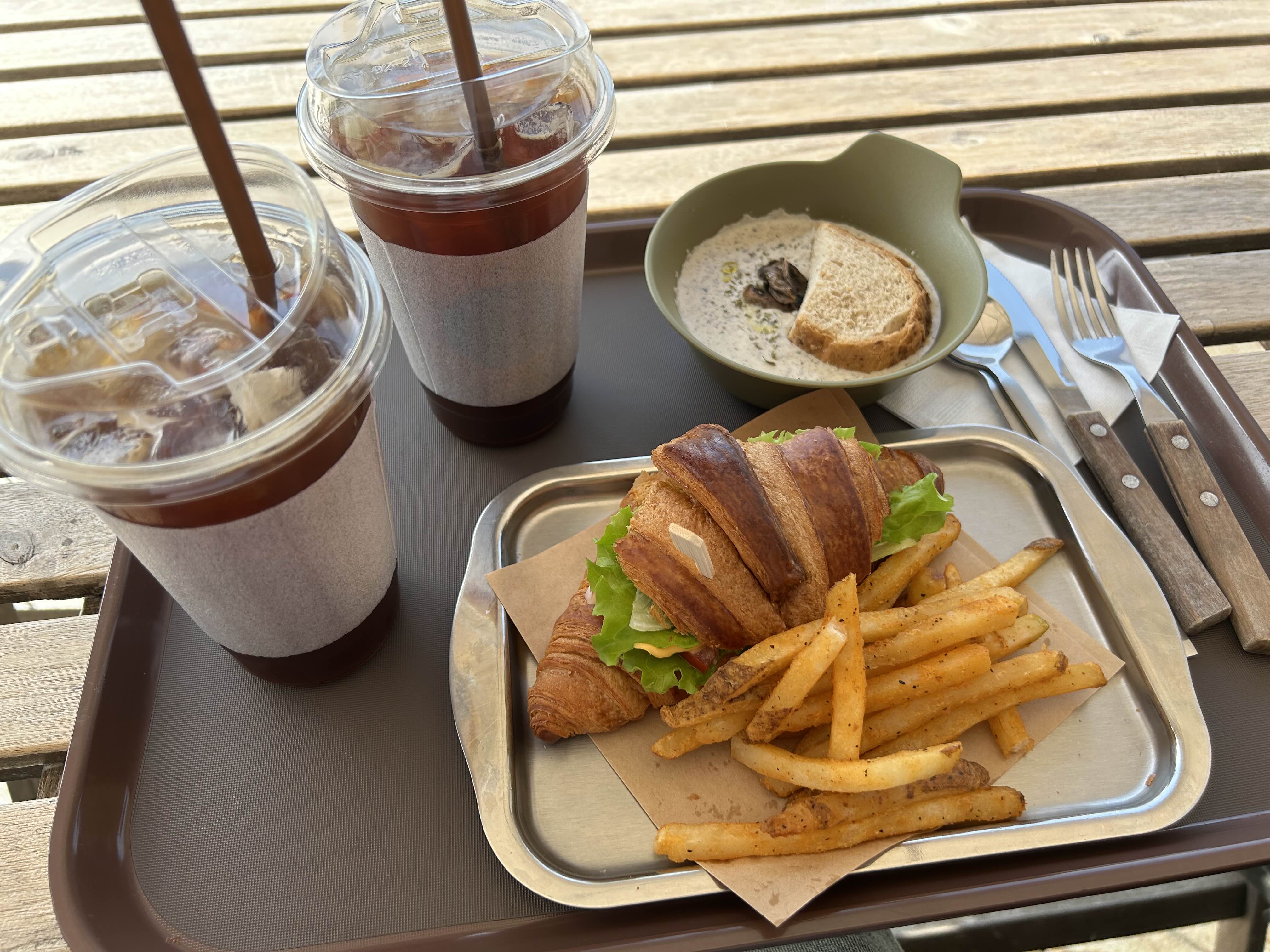 아이스 아메리카노 2잔이랑 크로와상 샌드위치, 스프 주문!