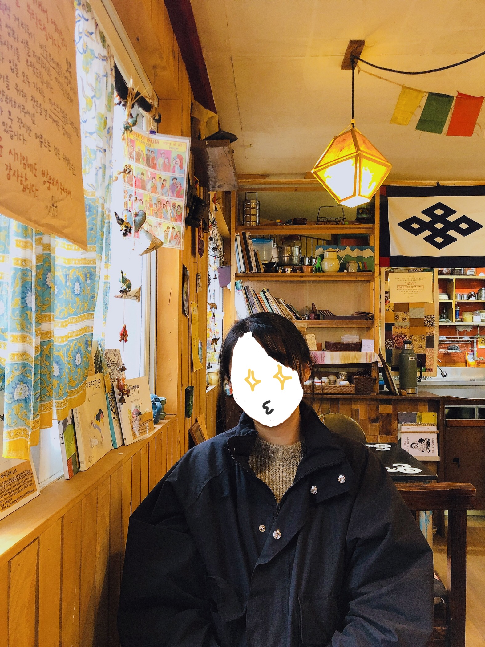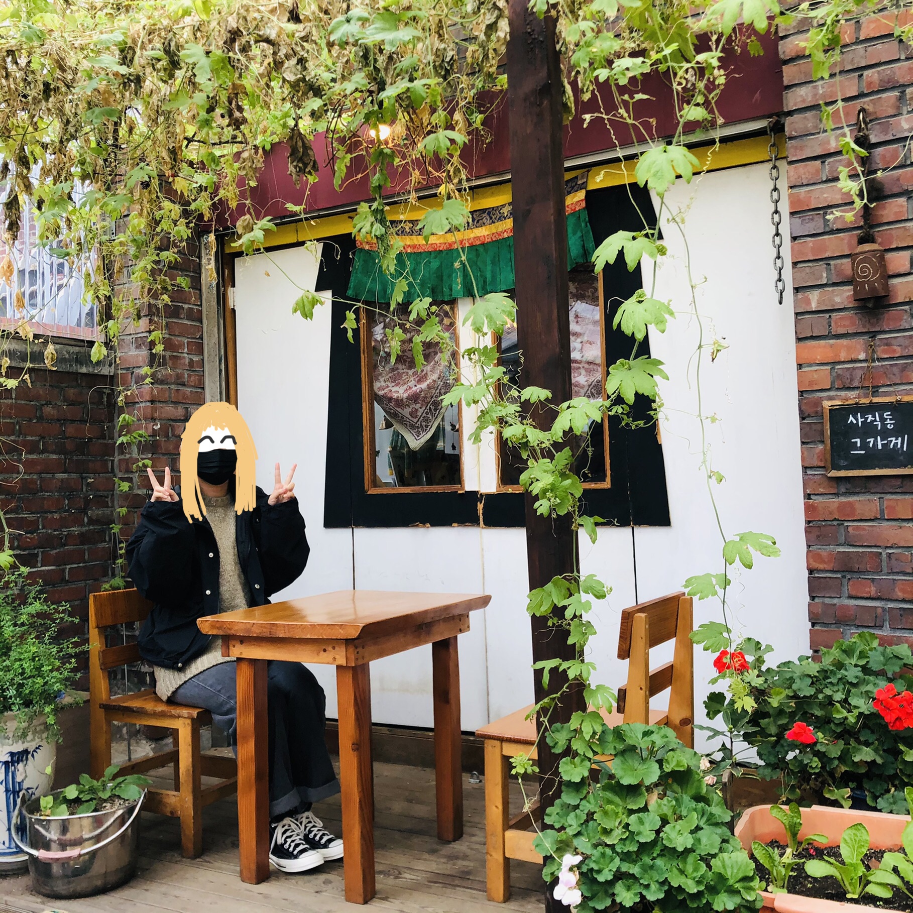 나무의자 자리가 뭔가 포토존 느낌 나길래 한 컷 찍어봤다. 얼굴 가릴겸 색칠하는거 은근 재밌눼~