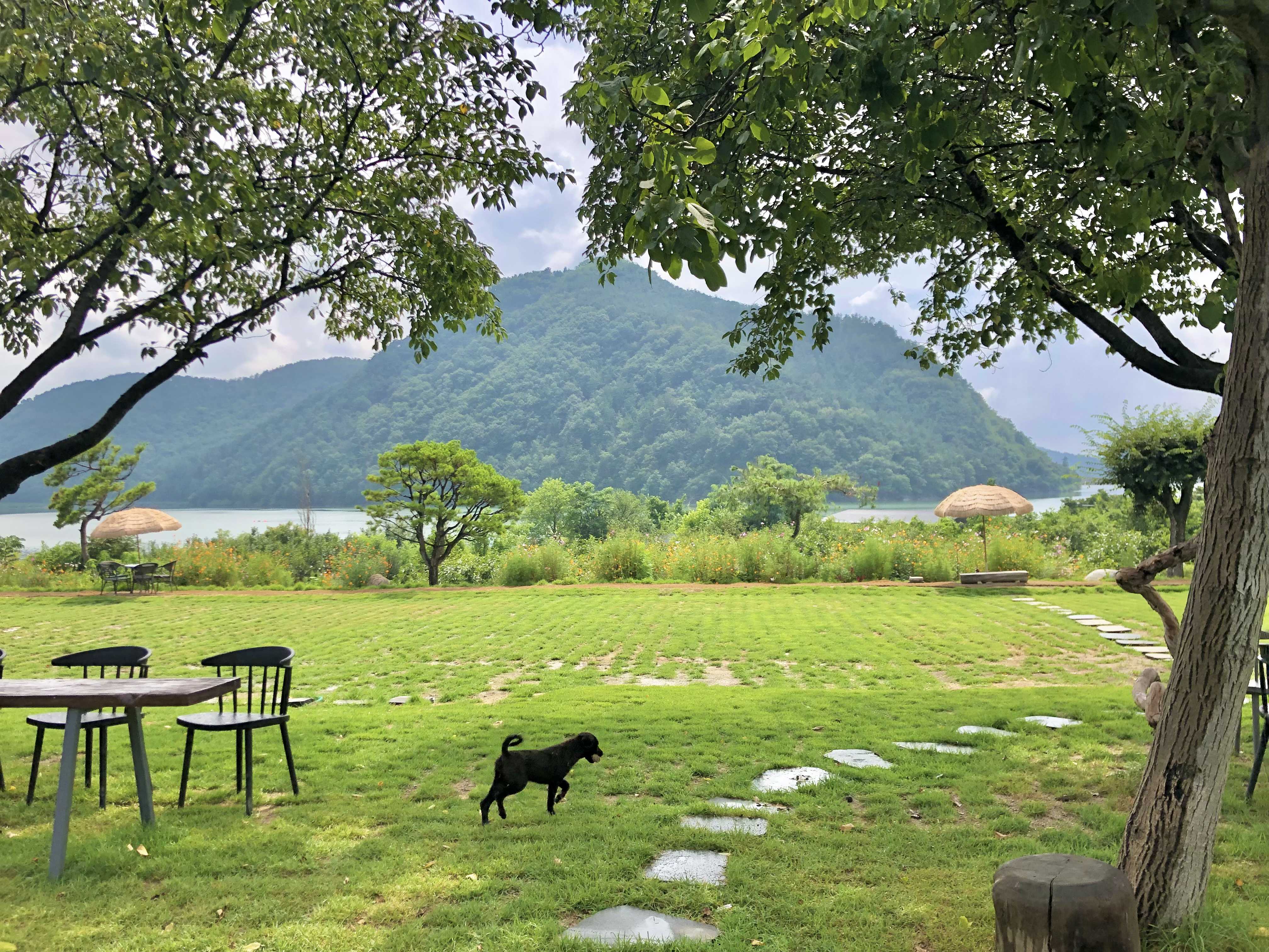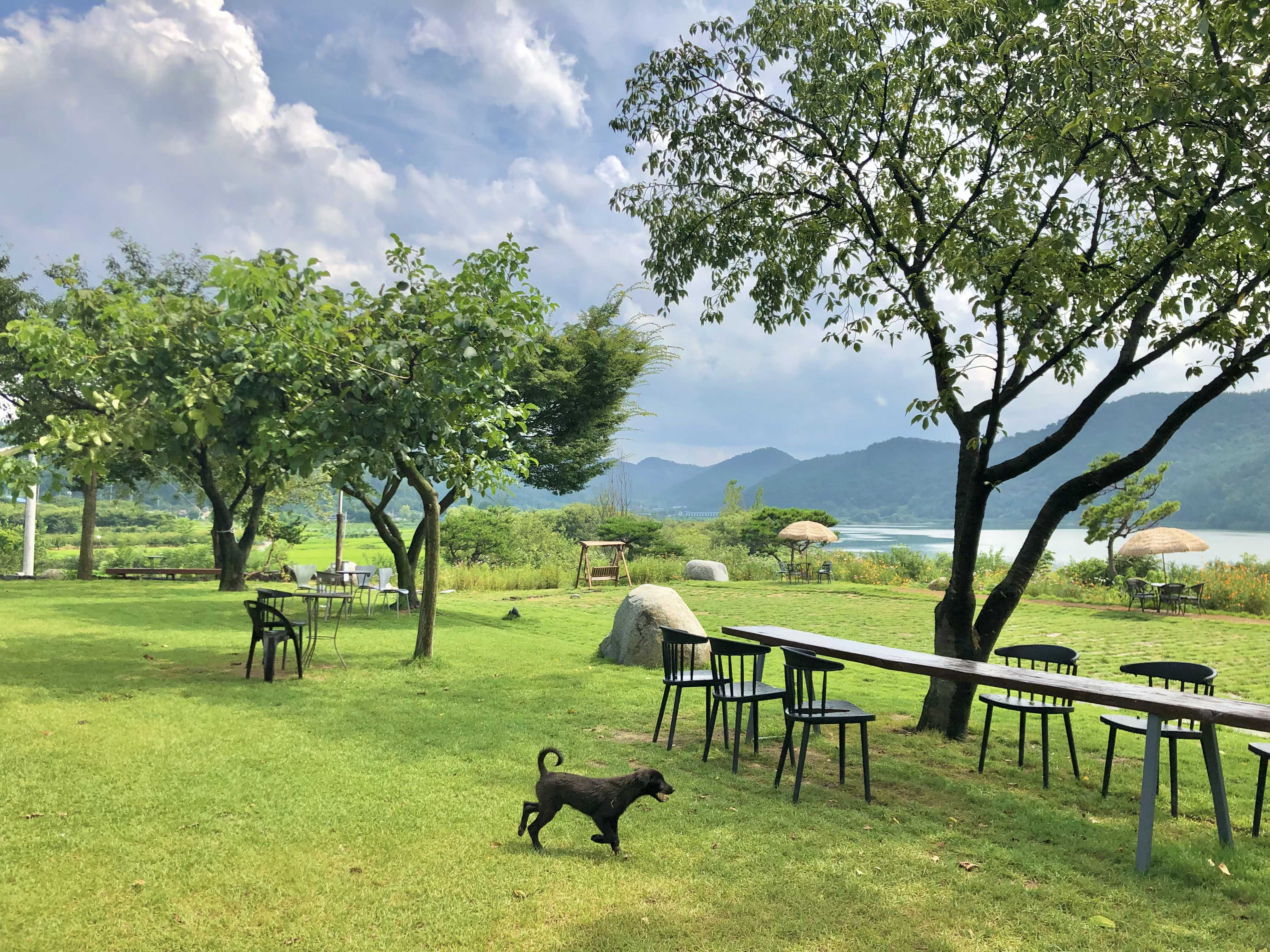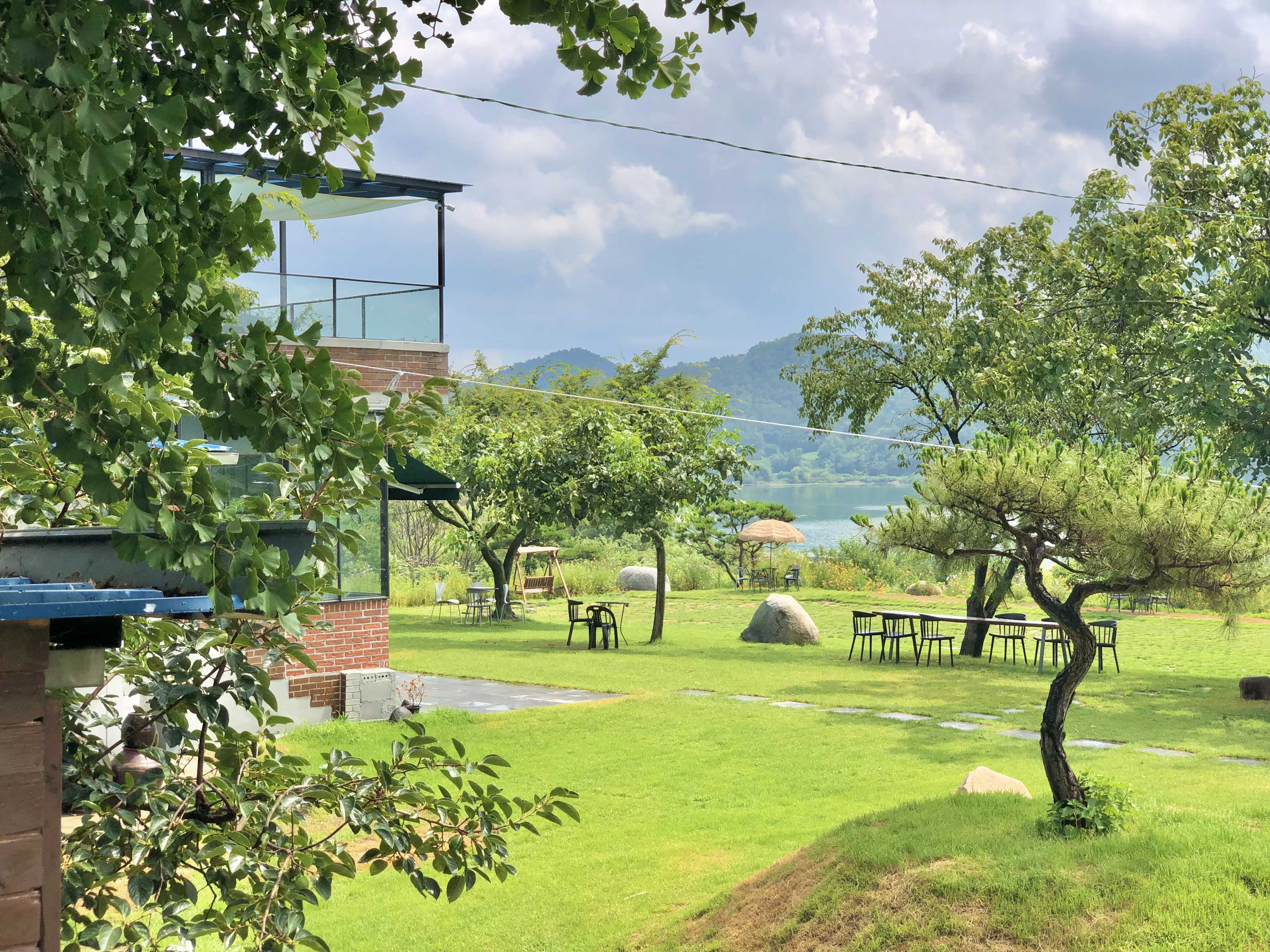탁 트인 달창저수지 뷰의 넓은 잔디가 있는 카페